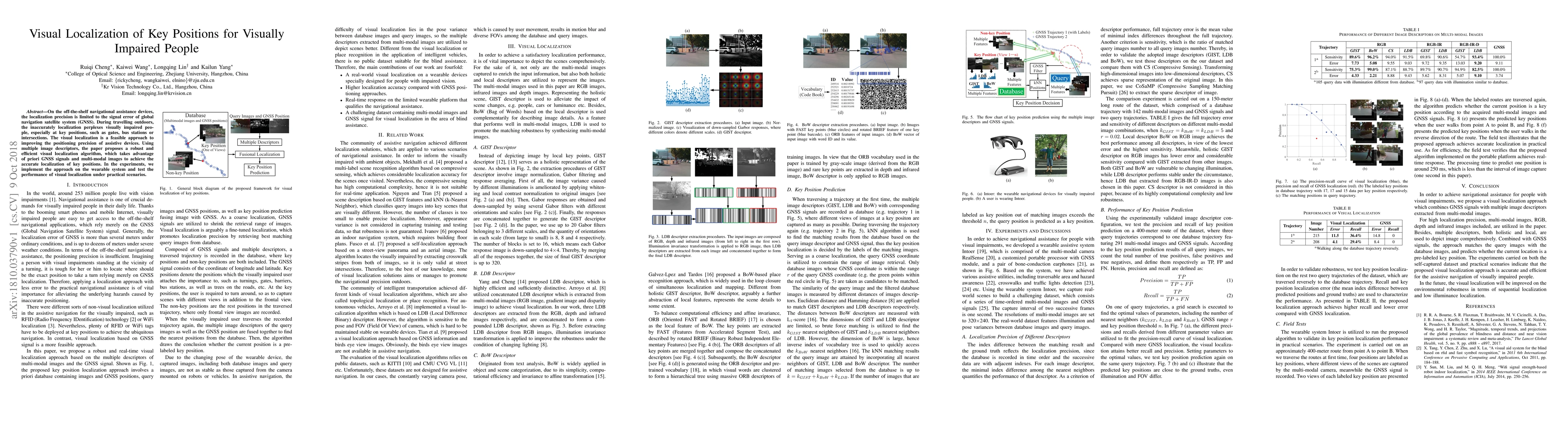On the off-the-shelf navigational assistance devices, the localization precision is limited to the signal error of global navigation satellite system (GNSS). During travelling outdoors, the inaccurately localization perplexes visually impaired people, especially at key positions, such as gates, bus stations or intersections. The visual localization is a feasible approach to improving the positioning precision of assistive devices. Using multiple image descriptors, the paper proposes a robust and efficient visual localization algorithm, which takes advantage of priori GNSS signals and multi-modal images to achieve the accurate localization of key positions. In the experiments, we implement the approach on the wearable system and test the performance of visual localization under practical scenarios.