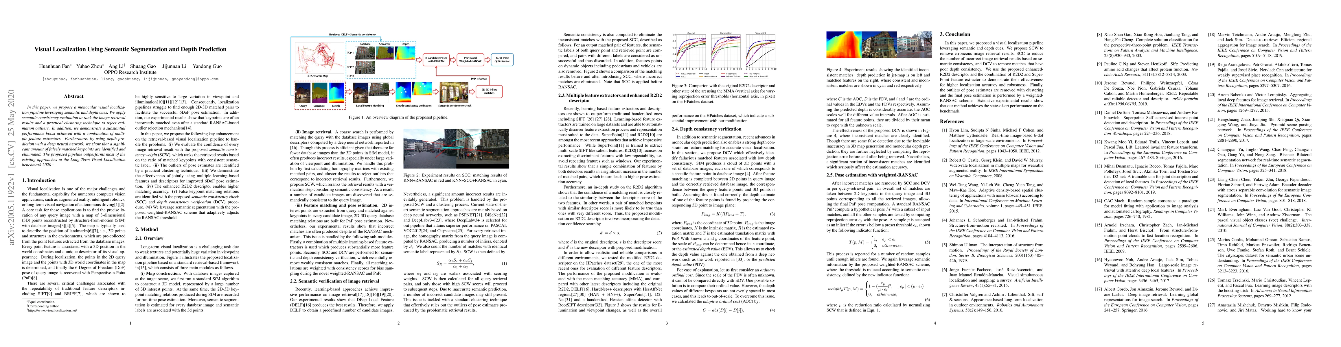 This paper presents a monocular visual localization method using semantic segmentation and depth prediction, achieving superior performance by ranking image retrieval results and employing clustering to filter outliers, along with a deep neural network for depth prediction to eliminate falsely matched keypoints. The proposed pipeline outperforms existing methods in the Long-Term Visual Localization benchmark 2020.