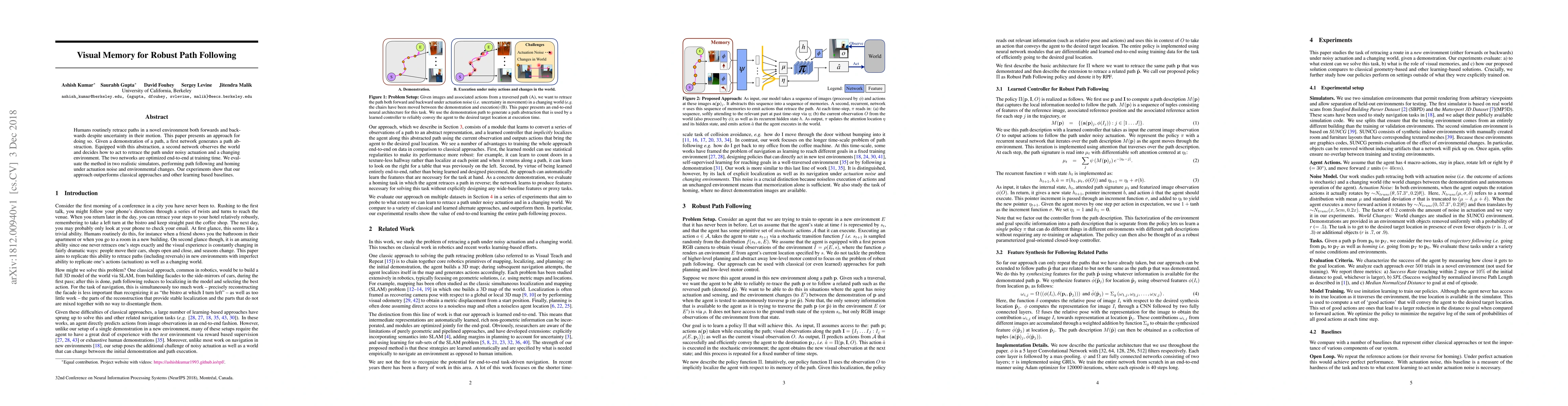 Humans routinely retrace paths in a novel environment both forwards and backwards despite uncertainty in their motion. This paper presents an approach for doing so. Given a demonstration of a path, a first network generates a path abstraction. Equipped with this abstraction, a second network observes the world and decides how to act to retrace the path under noisy actuation and a changing environment. The two networks are optimized end-to-end at training time. We evaluate the method in two realistic simulators, performing path following and homing under actuation noise and environmental changes. Our experiments show that our approach outperforms classical approaches and other learning based baselines.
