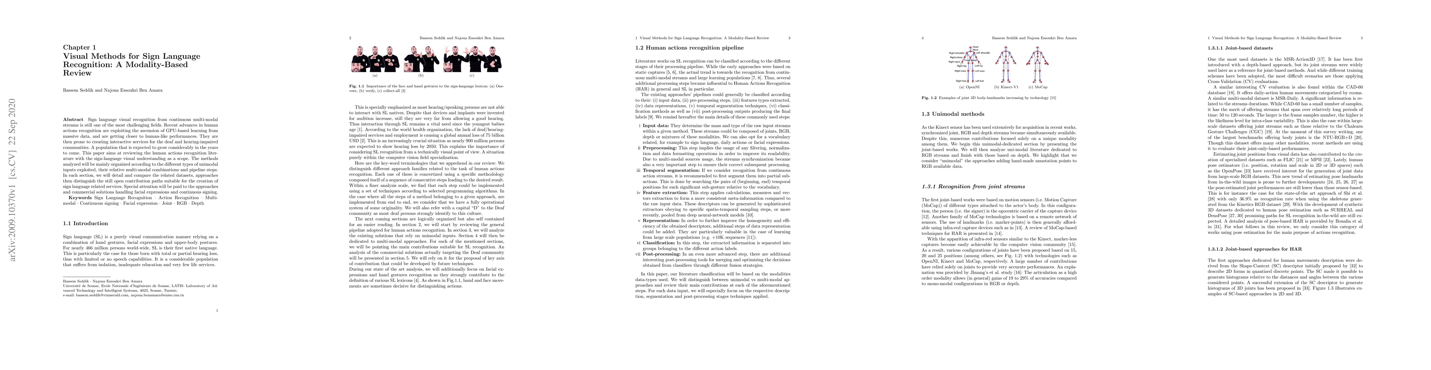This paper reviews visual methods for sign language recognition, focusing on unimodal inputs, multi-modal combinations, and pipeline steps. It highlights recent advances in GPU-based learning and discusses open paths for creating interactive services for the deaf and hearing-impaired, with special attention to facial expressions and continuous signing.