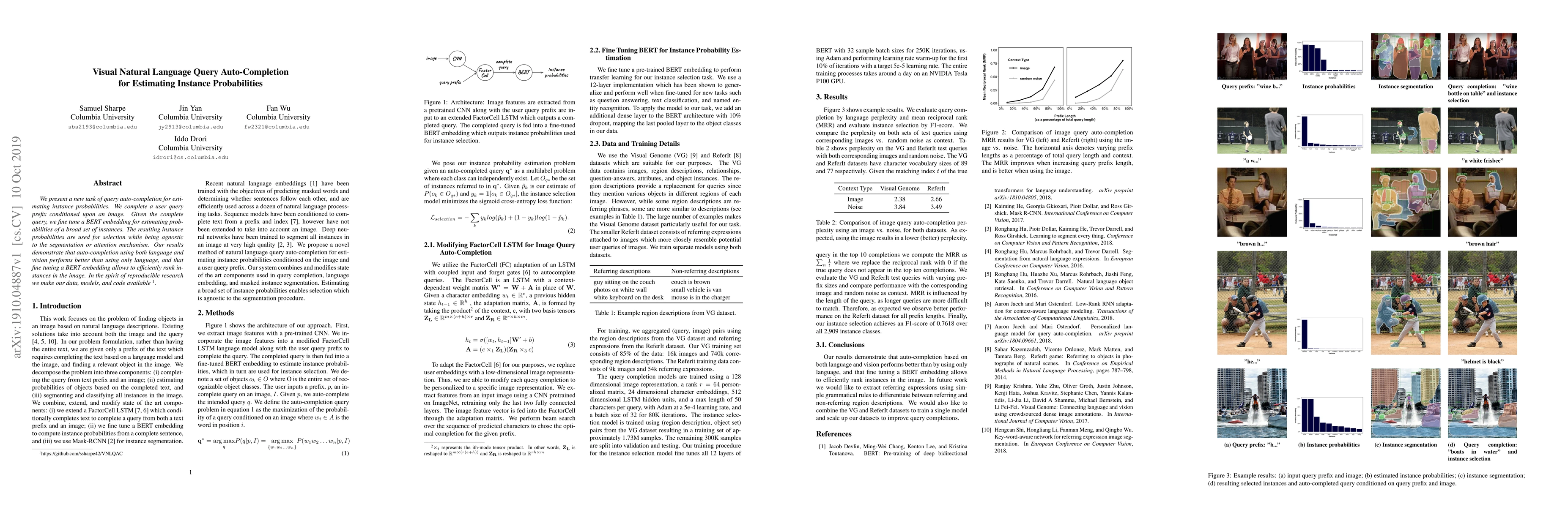 This paper introduces a method for visual natural language query auto-completion to estimate instance probabilities in images, showing improved performance over language-only approaches. It fine-tunes BERT embeddings to rank instances efficiently, and provides data, models, and code for reproducibility.