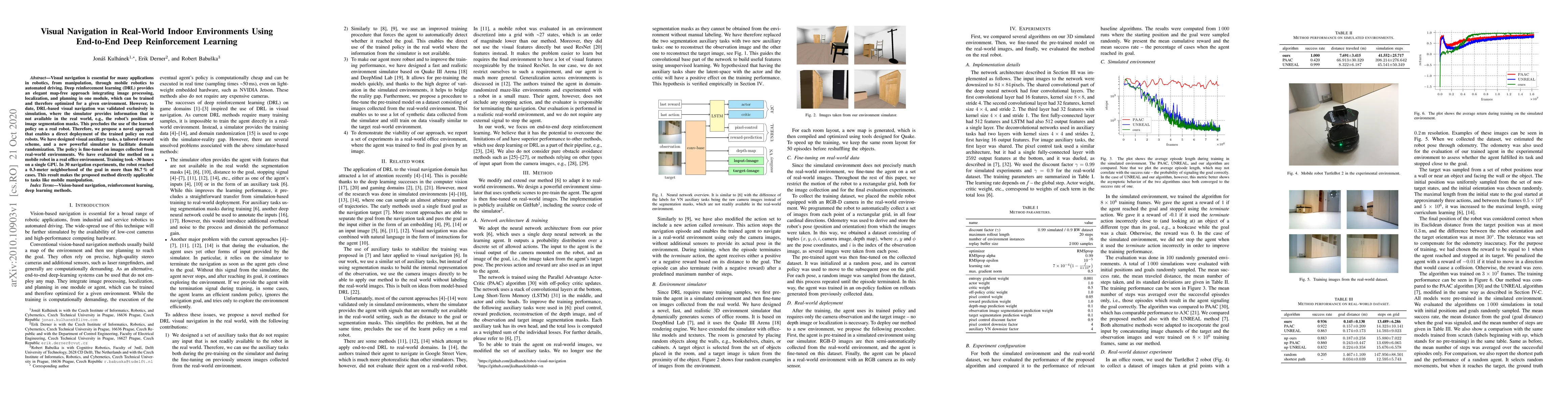 Visual navigation is essential for many applications in robotics, from manipulation, through mobile robotics to automated driving. Deep reinforcement learning (DRL) provides an elegant map-free approach integrating image processing, localization, and planning in one module, which can be trained and therefore optimized for a given environment. However, to date, DRL-based visual navigation was validated exclusively in simulation, where the simulator provides information that is not available in the real world, e.g., the robot's position or image segmentation masks. This precludes the use of the learned policy on a real robot. Therefore, we propose a novel approach that enables a direct deployment of the trained policy on real robots. We have designed visual auxiliary tasks, a tailored reward scheme, and a new powerful simulator to facilitate domain randomization. The policy is fine-tuned on images collected from real-world environments. We have evaluated the method on a mobile robot in a real office environment. The training took ~30 hours on a single GPU. In 30 navigation experiments, the robot reached a 0.3-meter neighborhood of the goal in more than 86.7% of cases. This result makes the proposed method directly applicable to tasks like mobile manipulation.