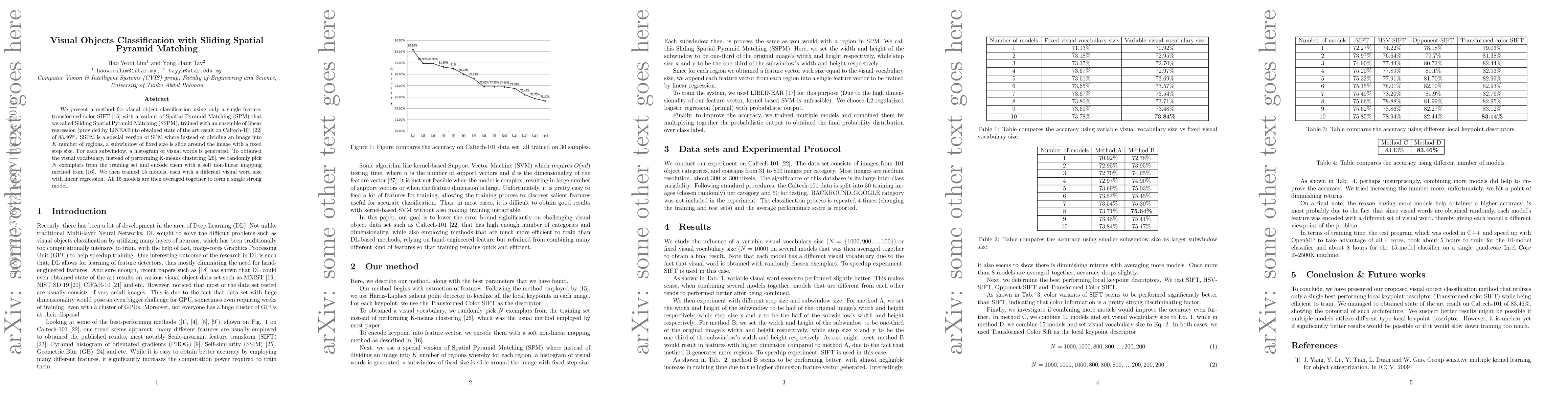 We present a method for visual object classification using only a single feature, transformed color SIFT with a variant of Spatial Pyramid Matching (SPM) that we called Sliding Spatial Pyramid Matching (SSPM), trained with an ensemble of linear regression (provided by LINEAR) to obtained state of the art result on Caltech-101 of 83.46%. SSPM is a special version of SPM where instead of dividing an image into K number of regions, a subwindow of fixed size is slide around the image with a fixed step size. For each subwindow, a histogram of visual words is generated. To obtained the visual vocabulary, instead of performing K-means clustering, we randomly pick N exemplars from the training set and encode them with a soft non-linear mapping method. We then trained 15 models, each with a different visual word size with linear regression. All 15 models are then averaged together to form a single strong model.