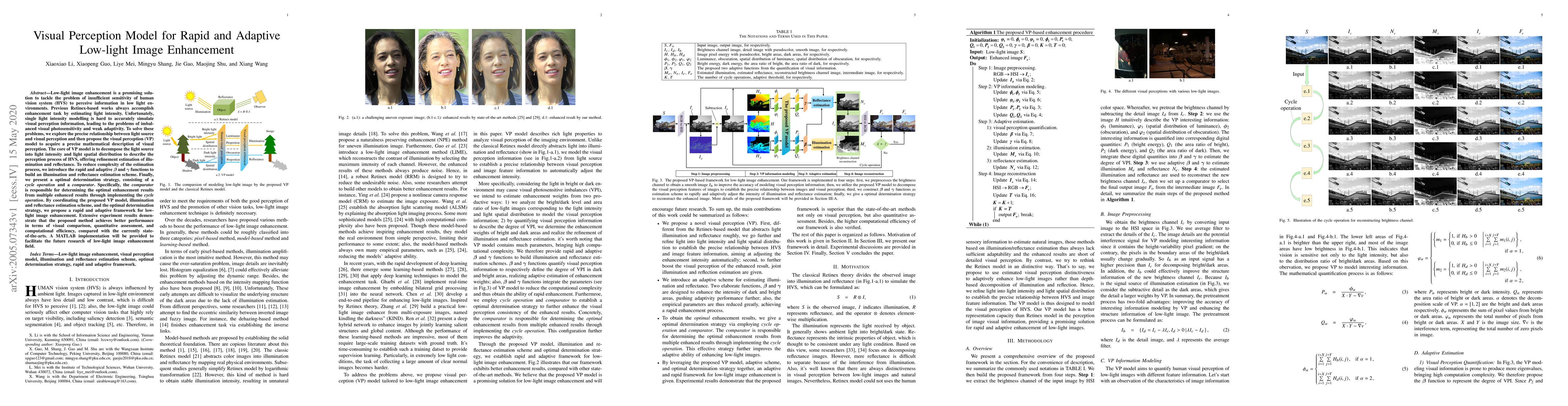 This paper proposes a visual perception model for enhancing low-light images by decomposing light into intensity and spatial distribution, introducing adaptive functions for estimation, and employing a cycle operation and comparator for optimal result determination. Experimental results show superior performance over existing methods in visual quality, quantitative metrics, and computational efficiency.