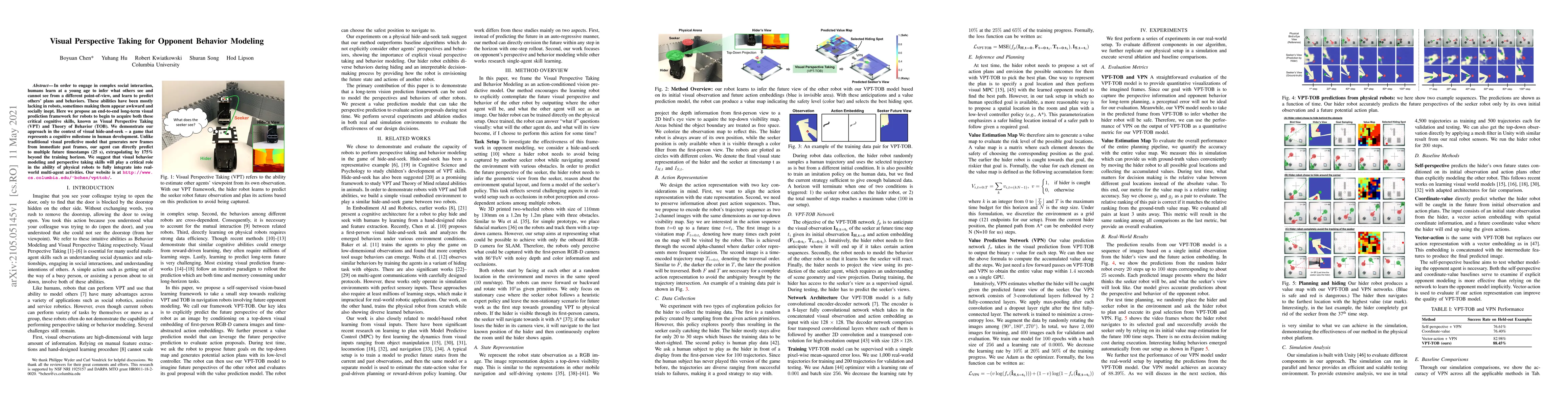 In order to engage in complex social interaction, humans learn at a young age to infer what others see and cannot see from a different point-of-view, and learn to predict others' plans and behaviors. These abilities have been mostly lacking in robots, sometimes making them appear awkward and socially inept. Here we propose an end-to-end long-term visual prediction framework for robots to begin to acquire both these critical cognitive skills, known as Visual Perspective Taking (VPT) and Theory of Behavior (TOB). We demonstrate our approach in the context of visual hide-and-seek - a game that represents a cognitive milestone in human development. Unlike traditional visual predictive model that generates new frames from immediate past frames, our agent can directly predict to multiple future timestamps (25s), extrapolating by 175% beyond the training horizon. We suggest that visual behavior modeling and perspective taking skills will play a critical role in the ability of physical robots to fully integrate into real-world multi-agent activities. Our website is at http://www.cs.columbia.edu/~bchen/vpttob/.