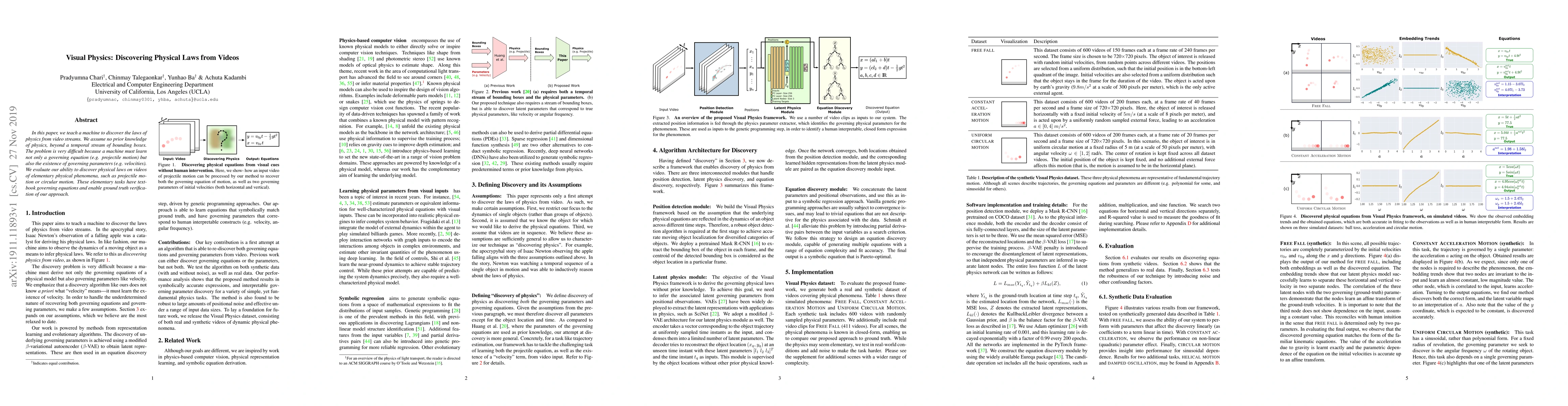 In this paper, we teach a machine to discover the laws of physics from video streams. We assume no prior knowledge of physics, beyond a temporal stream of bounding boxes. The problem is very difficult because a machine must learn not only a governing equation (e.g. projectile motion) but also the existence of governing parameters (e.g. velocities). We evaluate our ability to discover physical laws on videos of elementary physical phenomena, such as projectile motion or circular motion. These elementary tasks have textbook governing equations and enable ground truth verification of our approach.