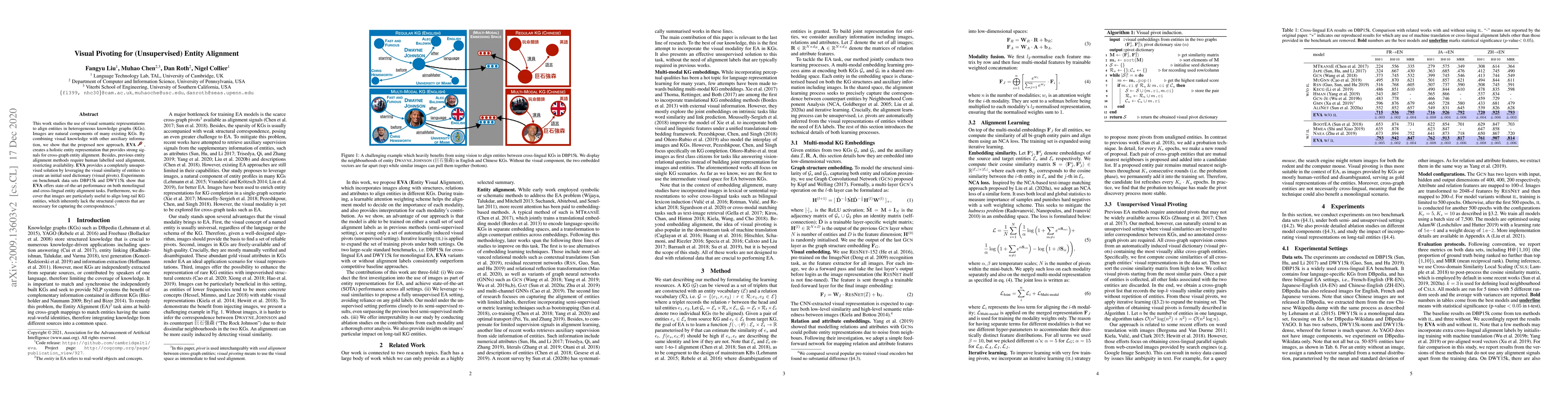 This paper proposes EVA, an unsupervised method for aligning entities in heterogeneous knowledge graphs using visual semantic representations and image-based pivoting. EVA achieves state-of-the-art performance in both monolingual and cross-lingual entity alignment tasks without requiring human-labeled seed alignments.