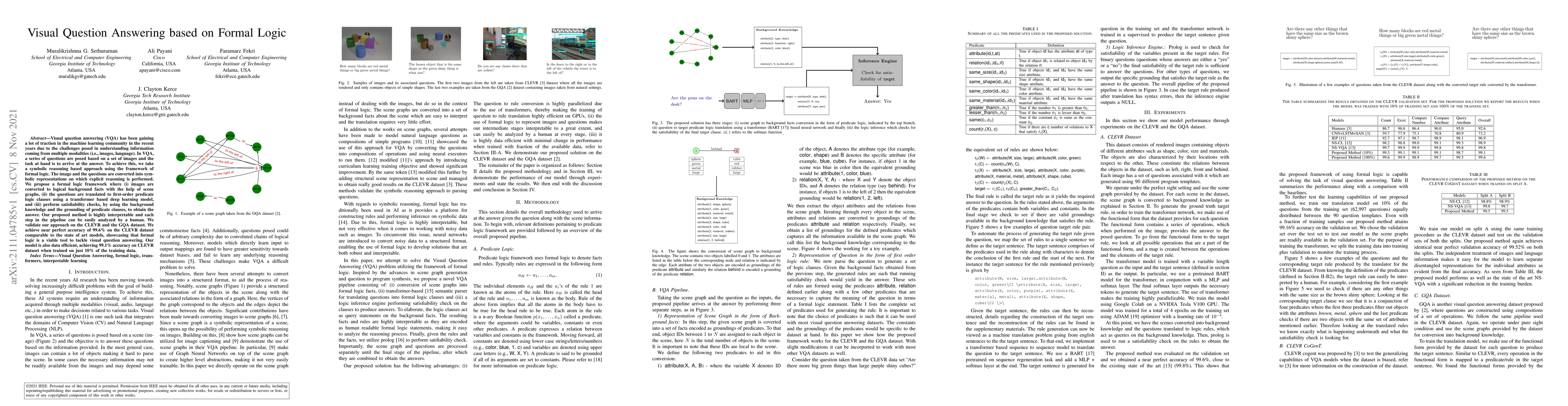 Visual question answering (VQA) has been gaining a lot of traction in the machine learning community in the recent years due to the challenges posed in understanding information coming from multiple modalities (i.e., images, language). In VQA, a series of questions are posed based on a set of images and the task at hand is to arrive at the answer. To achieve this, we take a symbolic reasoning based approach using the framework of formal logic. The image and the questions are converted into symbolic representations on which explicit reasoning is performed. We propose a formal logic framework where (i) images are converted to logical background facts with the help of scene graphs, (ii) the questions are translated to first-order predicate logic clauses using a transformer based deep learning model, and (iii) perform satisfiability checks, by using the background knowledge and the grounding of predicate clauses, to obtain the answer. Our proposed method is highly interpretable and each step in the pipeline can be easily analyzed by a human. We validate our approach on the CLEVR and the GQA dataset. We achieve near perfect accuracy of 99.6% on the CLEVR dataset comparable to the state of art models, showcasing that formal logic is a viable tool to tackle visual question answering. Our model is also data efficient, achieving 99.1% accuracy on CLEVR dataset when trained on just 10% of the training data.