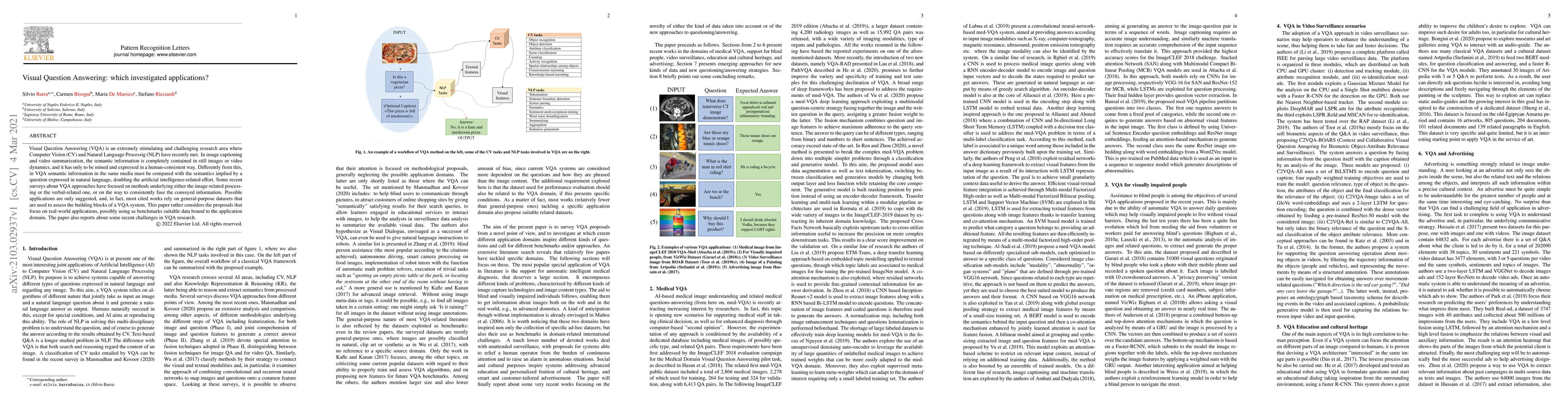 Visual Question Answering (VQA) is an extremely stimulating and challenging research area where Computer Vision (CV) and Natural Language Processig (NLP) have recently met. In image captioning and video summarization, the semantic information is completely contained in still images or video dynamics, and it has only to be mined and expressed in a human-consistent way. Differently from this, in VQA semantic information in the same media must be compared with the semantics implied by a question expressed in natural language, doubling the artificial intelligence-related effort. Some recent surveys about VQA approaches have focused on methods underlying either the image-related processing or the verbal-related one, or on the way to consistently fuse the conveyed information. Possible applications are only suggested, and, in fact, most cited works rely on general-purpose datasets that are used to assess the building blocks of a VQA system. This paper rather considers the proposals that focus on real-world applications, possibly using as benchmarks suitable data bound to the application domain. The paper also reports about some recent challenges in VQA research.