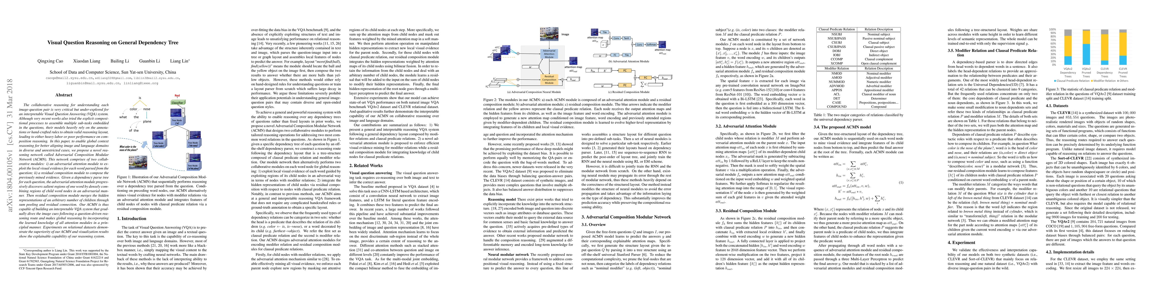 The collaborative reasoning for understanding each image-question pair is very critical but under-explored for an interpretable Visual Question Answering (VQA) system. Although very recent works also tried the explicit compositional processes to assemble multiple sub-tasks embedded in the questions, their models heavily rely on the annotations or hand-crafted rules to obtain valid reasoning layout, leading to either heavy labor or poor performance on composition reasoning. In this paper, to enable global context reasoning for better aligning image and language domains in diverse and unrestricted cases, we propose a novel reasoning network called Adversarial Composition Modular Network (ACMN). This network comprises of two collaborative modules: i) an adversarial attention module to exploit the local visual evidence for each word parsed from the question; ii) a residual composition module to compose the previously mined evidence. Given a dependency parse tree for each question, the adversarial attention module progressively discovers salient regions of one word by densely combining regions of child word nodes in an adversarial manner. Then residual composition module merges the hidden representations of an arbitrary number of children through sum pooling and residual connection. Our ACMN is thus capable of building an interpretable VQA system that gradually dives the image cues following a question-driven reasoning route and makes global reasoning by incorporating the learned knowledge of all attention modules in a principled manner. Experiments on relational datasets demonstrate the superiority of our ACMN and visualization results show the explainable capability of our reasoning system.