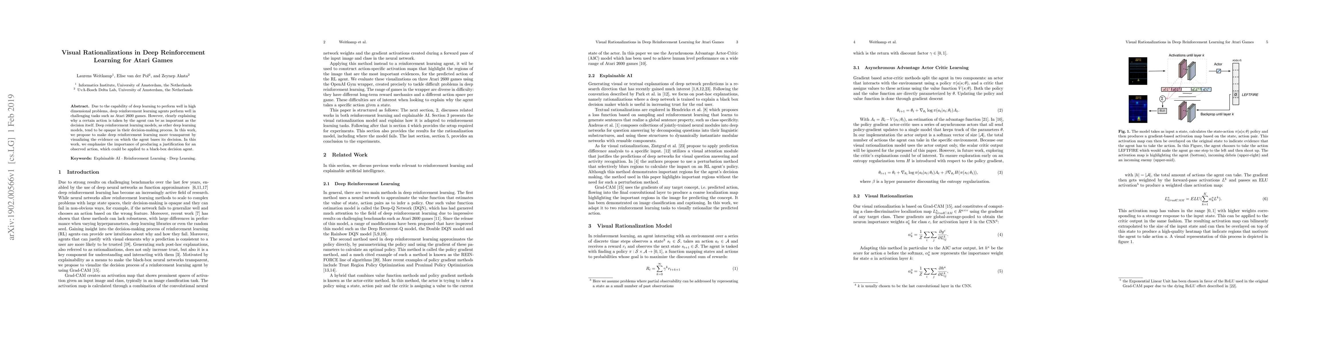 This paper proposes a method to visualize the decision-making process of deep reinforcement learning agents in Atari games, aiming to enhance transparency and explainability. The authors emphasize the importance of providing justifications for actions taken by the agent, thereby addressing the opacity common in deep learning models.