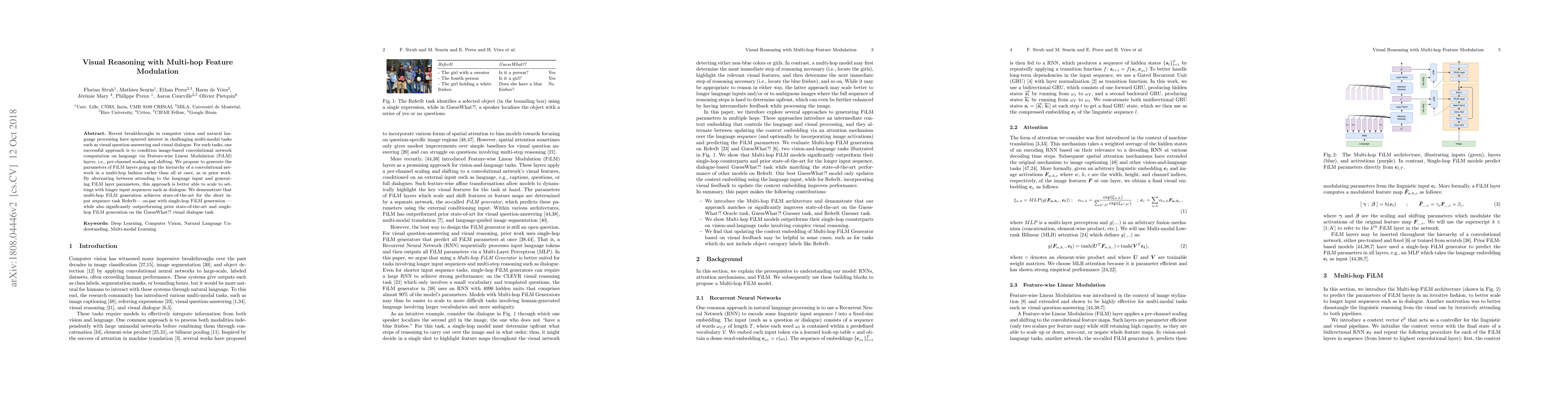 This paper proposes a new approach to visual reasoning using multi-hop feature modulation, achieving state-of-the-art results in two visual tasks: ReferIt and GuessWhat?! It improves upon existing methods by generating FiLM layer parameters in a hierarchical manner.