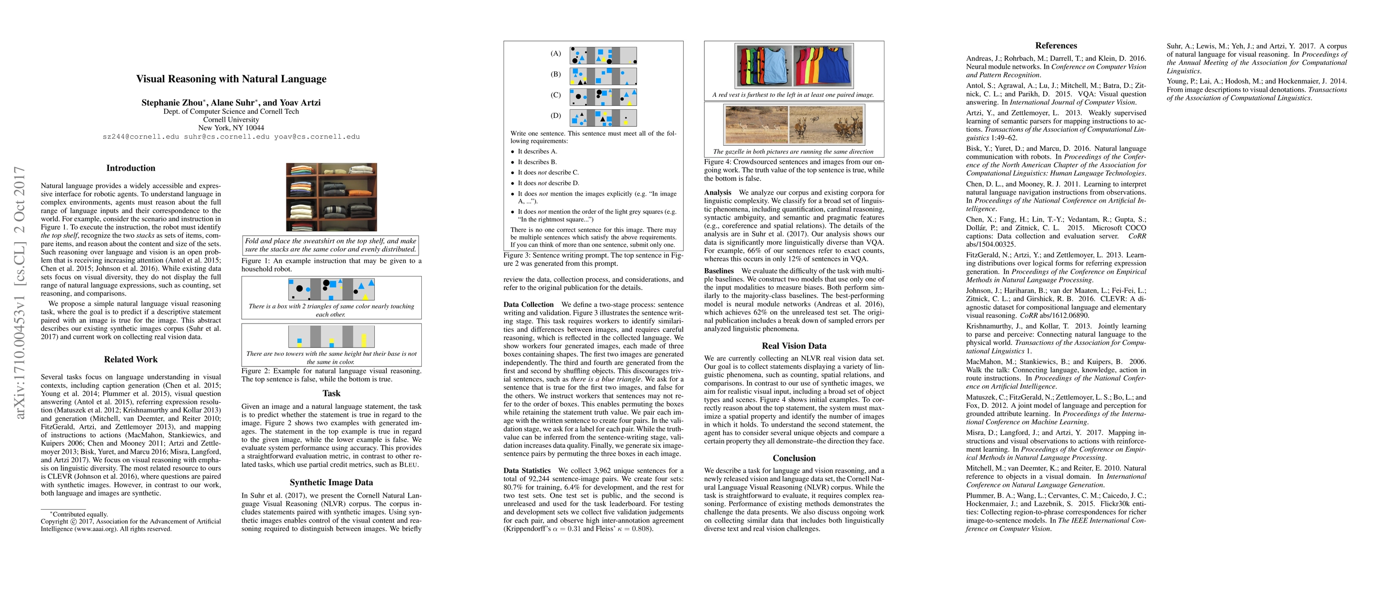 Natural language provides a widely accessible and expressive interface for robotic agents. To understand language in complex environments, agents must reason about the full range of language inputs and their correspondence to the world. Such reasoning over language and vision is an open problem that is receiving increasing attention. While existing data sets focus on visual diversity, they do not display the full range of natural language expressions, such as counting, set reasoning, and comparisons. We propose a simple task for natural language visual reasoning, where images are paired with descriptive statements. The task is to predict if a statement is true for the given scene. This abstract describes our existing synthetic images corpus and our current work on collecting real vision data.