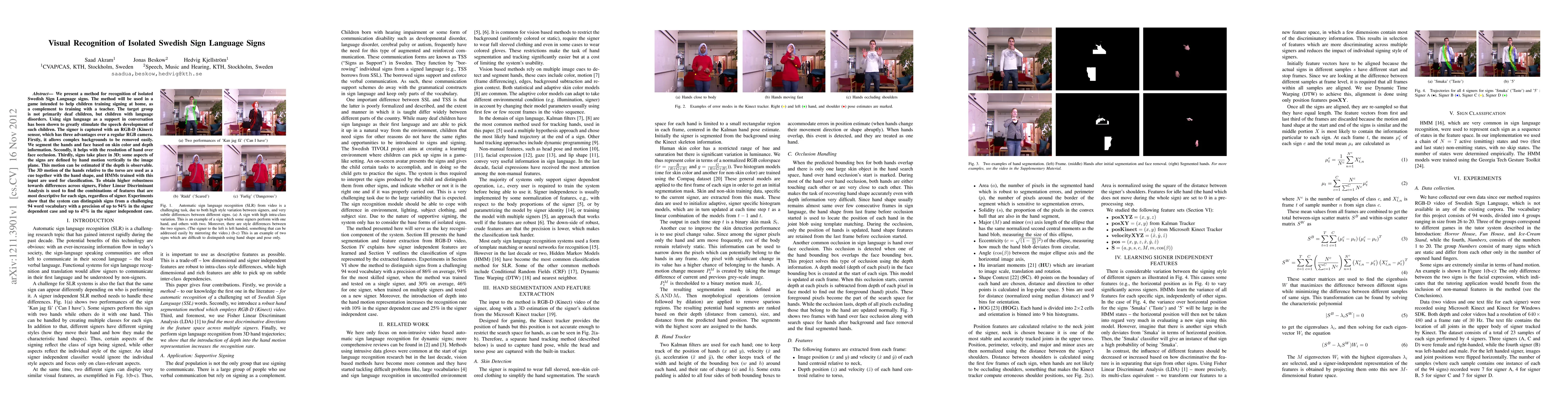 This paper proposes a method for recognizing isolated Swedish Sign Language signs using an RGB-D sensor to capture signers, aiding children with language disorders in training sign language at home. The system segments hands and faces using skin color and depth information, and employs 3D hand motion and HMMs for classification, achieving up to 94% precision for signer-dependent recognition and 47% for signer-independent.