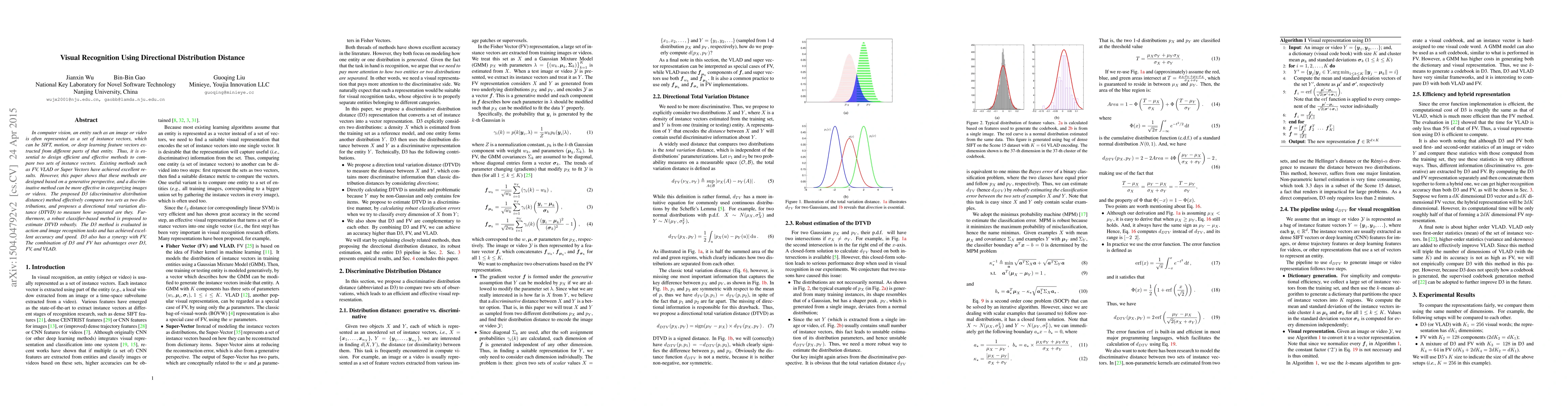 A new method called D3 (discriminative distribution distance) improves visual recognition by comparing two sets of instance vectors as distributions, achieving excellent accuracy and speed in action and image recognition tasks.