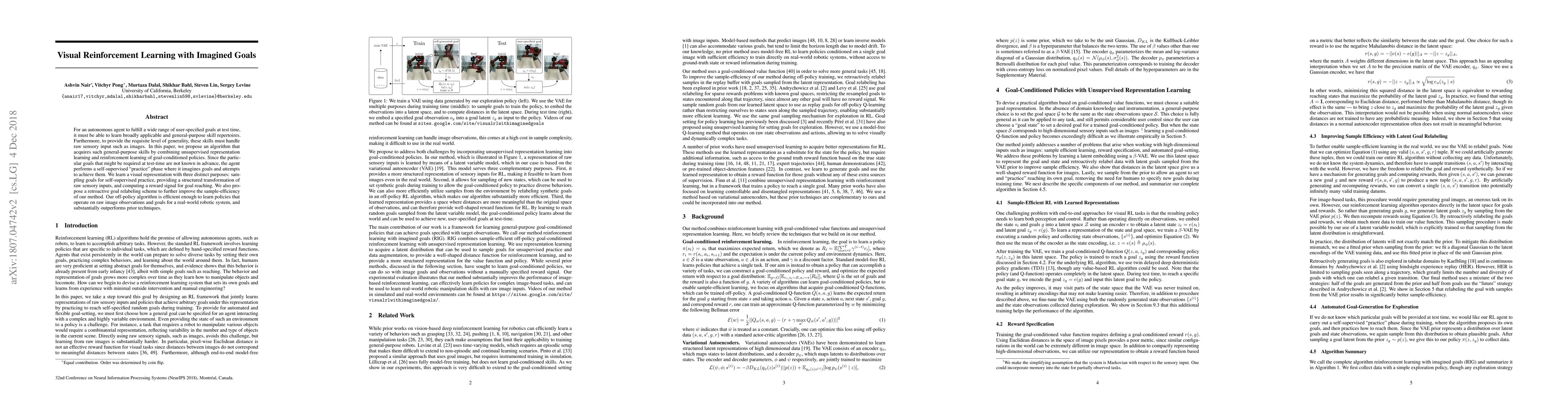 This paper introduces an algorithm that combines unsupervised representation learning and reinforcement learning to teach an autonomous agent general-purpose skills applicable to unseen goals, utilizing self-supervised practice with imagined goals. The proposed method improves sample efficiency through retroactive goal relabeling and outperforms previous techniques in real-world robotic applications.