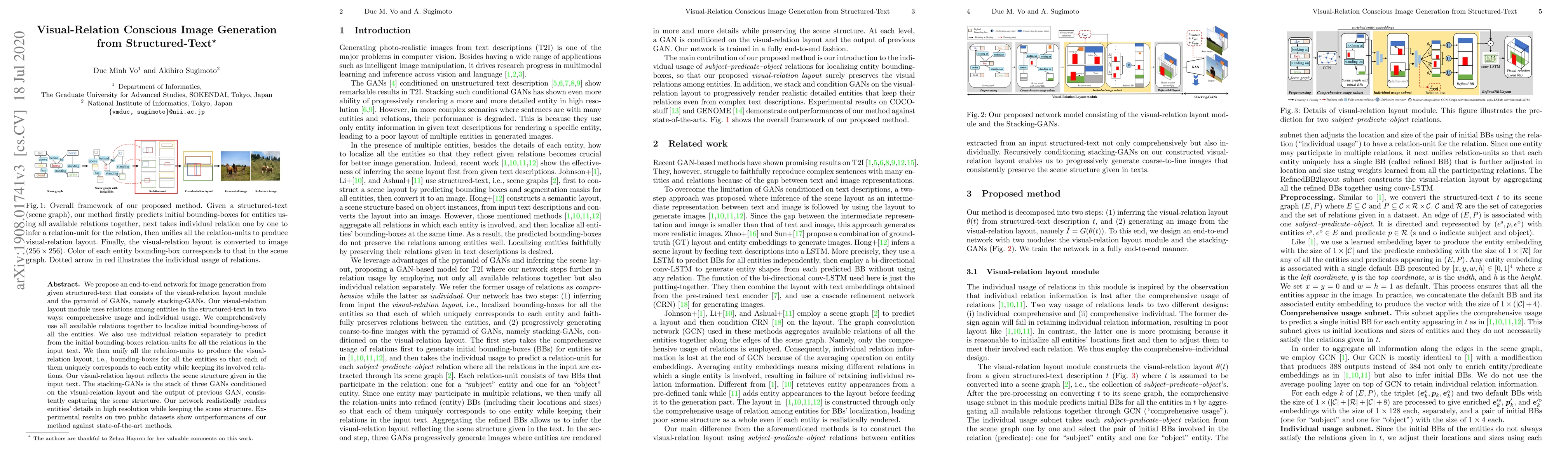 We propose an end-to-end network for image generation from given structured-text that consists of the visual-relation layout module and the pyramid of GANs, namely stacking-GANs. Our visual-relation layout module uses relations among entities in the structured-text in two ways: comprehensive usage and individual usage. We comprehensively use all available relations together to localize initial bounding-boxes of all the entities. We also use individual relation separately to predict from the initial bounding-boxes relation-units for all the relations in the input text. We then unify all the relation-units to produce the visual-relation layout, i.e., bounding-boxes for all the entities so that each of them uniquely corresponds to each entity while keeping its involved relations. Our visual-relation layout reflects the scene structure given in the input text. The stacking-GANs is the stack of three GANs conditioned on the visual-relation layout and the output of previous GAN, consistently capturing the scene structure. Our network realistically renders entities' details in high resolution while keeping the scene structure. Experimental results on two public datasets show outperformances of our method against state-of-the-art methods.