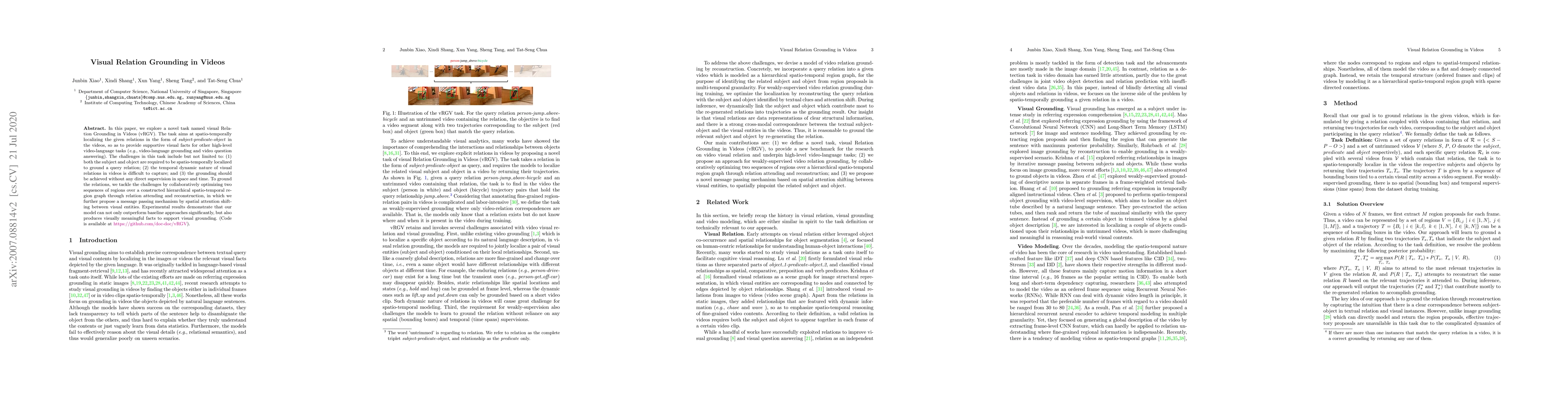 In this paper, we explore a novel task named visual Relation Grounding in Videos (vRGV). The task aims at spatio-temporally localizing the given relations in the form of subject-predicate-object in the videos, so as to provide supportive visual facts for other high-level video-language tasks (e.g., video-language grounding and video question answering). The challenges in this task include but not limited to: (1) both the subject and object are required to be spatio-temporally localized to ground a query relation; (2) the temporal dynamic nature of visual relations in videos is difficult to capture; and (3) the grounding should be achieved without any direct supervision in space and time. To ground the relations, we tackle the challenges by collaboratively optimizing two sequences of regions over a constructed hierarchical spatio-temporal region graph through relation attending and reconstruction, in which we further propose a message passing mechanism by spatial attention shifting between visual entities. Experimental results demonstrate that our model can not only outperform baseline approaches significantly, but also produces visually meaningful facts to support visual grounding. (Code is available at https://github.com/doc-doc/vRGV).