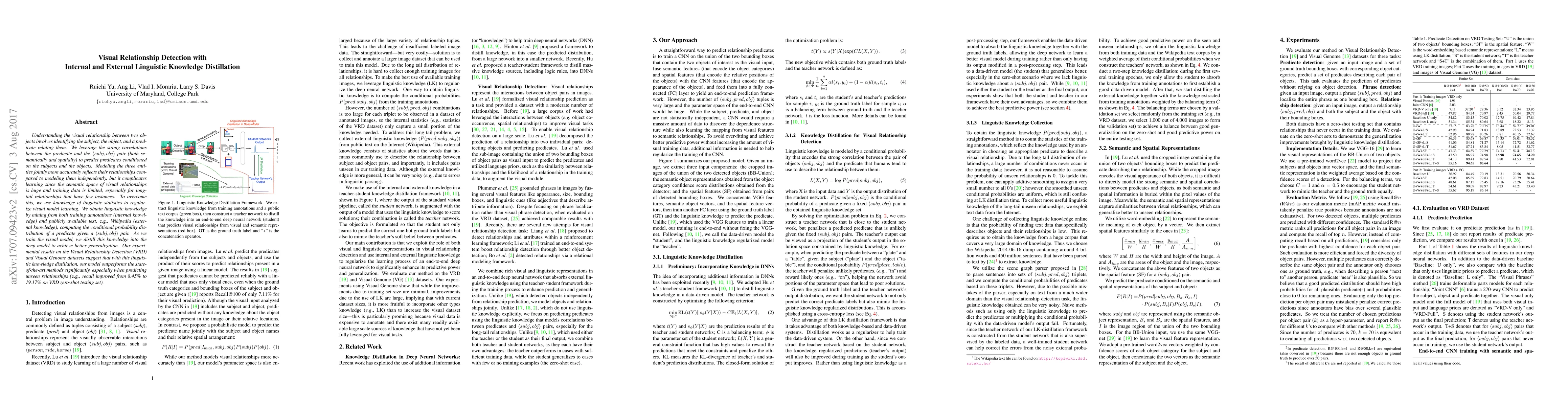 This paper proposes a method for visual relationship detection by distilling internal and external linguistic knowledge to regularize the learning of a visual model. The approach uses both training annotations and external text sources like Wikipedia to compute predicate probabilities, leading to improved performance, especially for long-tail relationships, as demonstrated by significant gains in zero-shot testing recall on VRD and Visual Genome datasets.