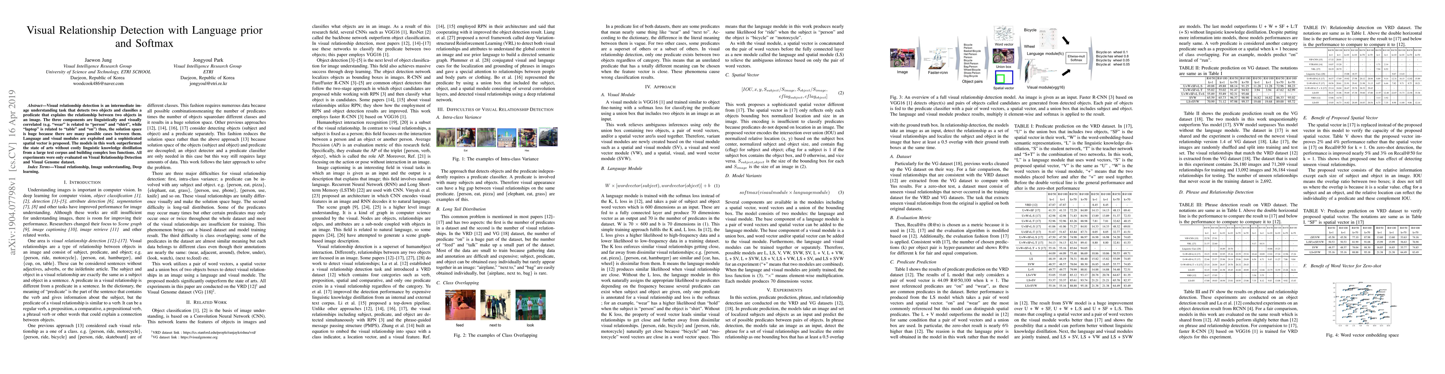 Visual relationship detection is an intermediate image understanding task that detects two objects and classifies a predicate that explains the relationship between two objects in an image. The three components are linguistically and visually correlated (e.g. "wear" is related to "person" and "shirt", while "laptop" is related to "table" and "on") thus, the solution space is huge because there are many possible cases between them. Language and visual modules are exploited and a sophisticated spatial vector is proposed. The models in this work outperformed the state of arts without costly linguistic knowledge distillation from a large text corpus and building complex loss functions. All experiments were only evaluated on Visual Relationship Detection and Visual Genome dataset.