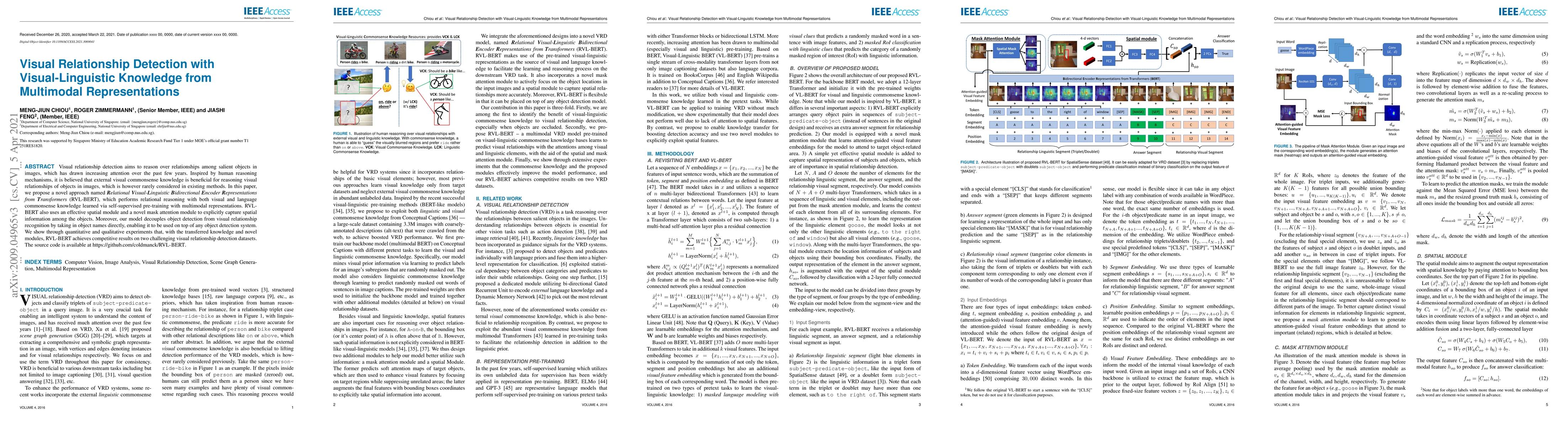 This paper proposes RVL-BERT, a novel method for visual relationship detection that incorporates visual-linguistic knowledge from multimodal representations. The approach combines self-supervised pre-training with a spatial module and mask attention to capture object relationships, achieving competitive results on visual relationship datasets.