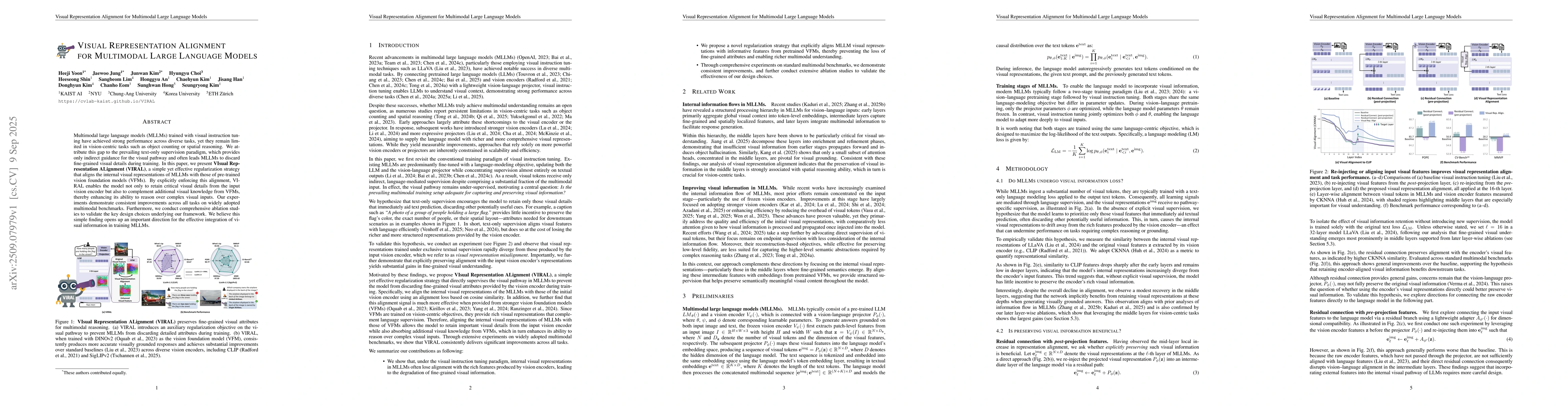 Multimodal large language models (MLLMs) trained with visual instruction tuning have achieved strong performance across diverse tasks, yet they remain limited in vision-centric tasks such as object counting or spatial reasoning. We attribute this gap to the prevailing text-only supervision paradigm, which provides only indirect guidance for the visual pathway and often leads MLLMs to discard fine-grained visual details during training. In this paper, we present VIsual Representation ALignment (VIRAL), a simple yet effective regularization strategy that aligns the internal visual representations of MLLMs with those of pre-trained vision foundation models (VFMs). By explicitly enforcing this alignment, VIRAL enables the model not only to retain critical visual details from the input vision encoder but also to complement additional visual knowledge from VFMs, thereby enhancing its ability to reason over complex visual inputs. Our experiments demonstrate consistent improvements across all tasks on widely adopted multimodal benchmarks. Furthermore, we conduct comprehensive ablation studies to validate the key design choices underlying our framework. We believe this simple finding opens up an important direction for the effective integration of visual information in training MLLMs.