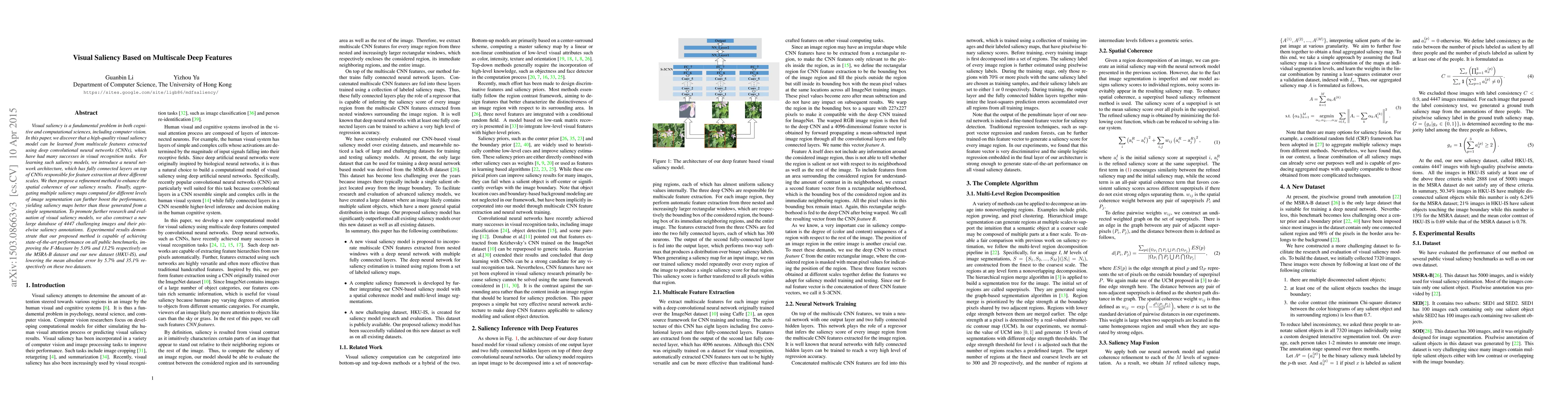 This CVPR 2015 paper proposes a visual saliency model trained with multiscale deep features from CNNs, achieving state-of-the-art performance by enhancing saliency maps through spatial coherence refinement and multi-level segmentation. The authors also introduce a new database for further research and evaluation.