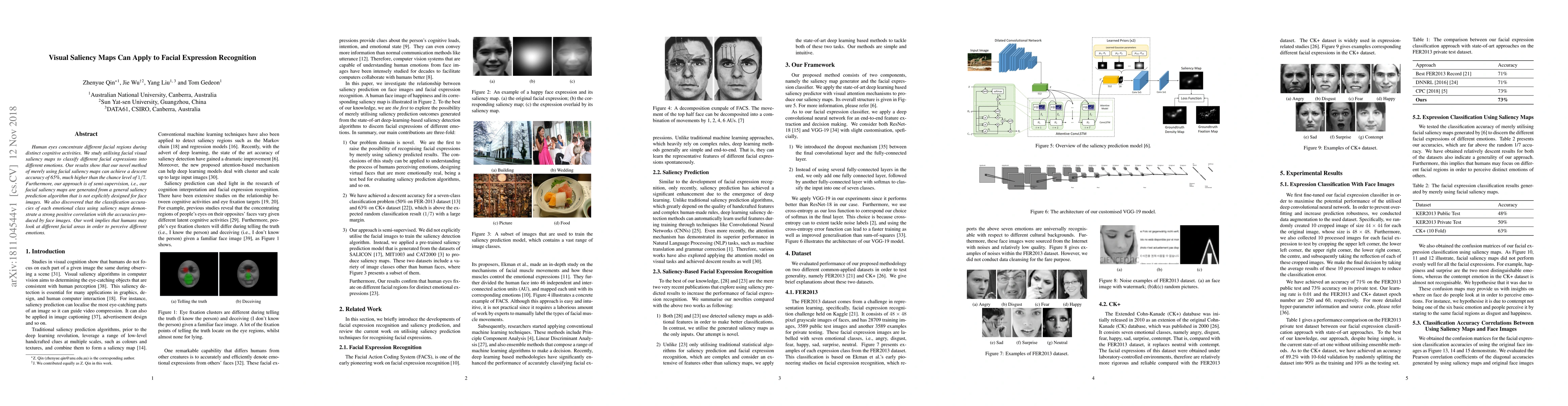This paper explores using facial visual saliency maps to recognize different facial expressions, achieving 65% accuracy, significantly above chance. The method employs a general saliency prediction algorithm, indicating that human attention to different facial regions correlates with emotion perception.