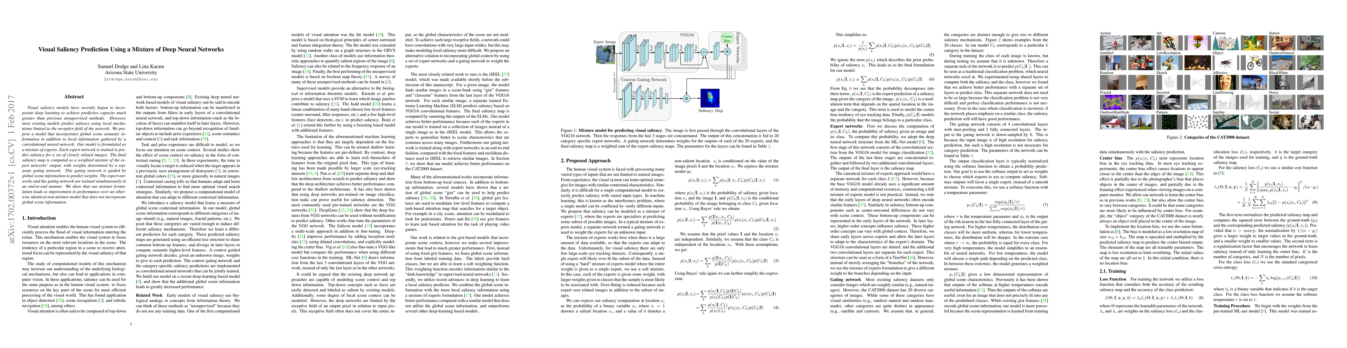 This paper proposes a mixture of deep neural networks to predict visual saliency by incorporating both local and global scene semantic information. The model uses a gating network to weight outputs from expert networks, each trained for specific image types, leading to improved performance over local-only models.