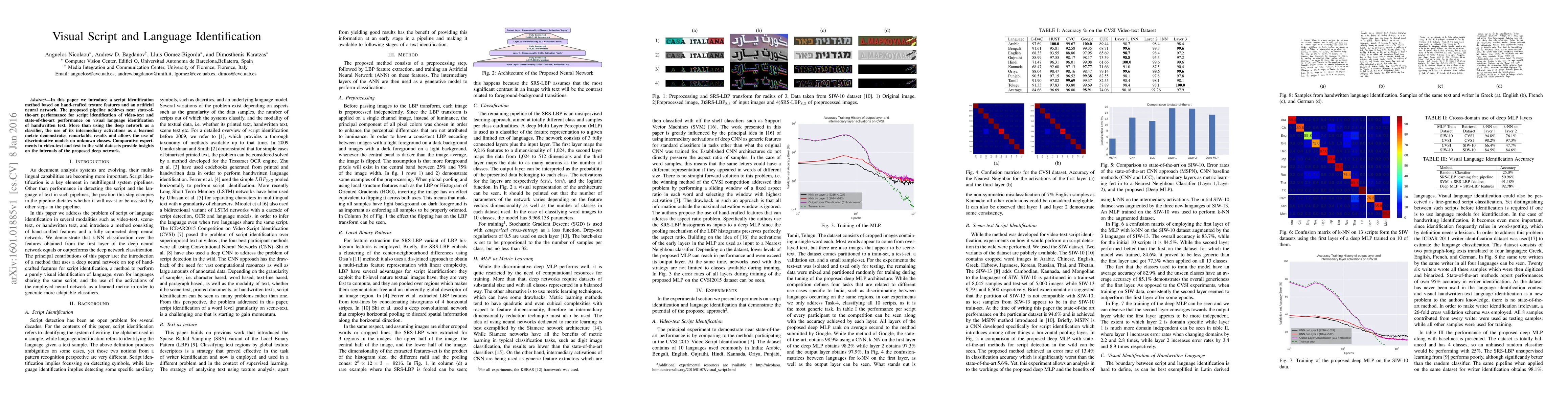 In this paper we introduce a script identification method based on hand-crafted texture features and an artificial neural network. The proposed pipeline achieves near state-of-the-art performance for script identification of video-text and state-of-the-art performance on visual language identification of handwritten text. More than using the deep network as a classifier, the use of its intermediary activations as a learned metric demonstrates remarkable results and allows the use of discriminative models on unknown classes. Comparative experiments in video-text and text in the wild datasets provide insights on the internals of the proposed deep network.