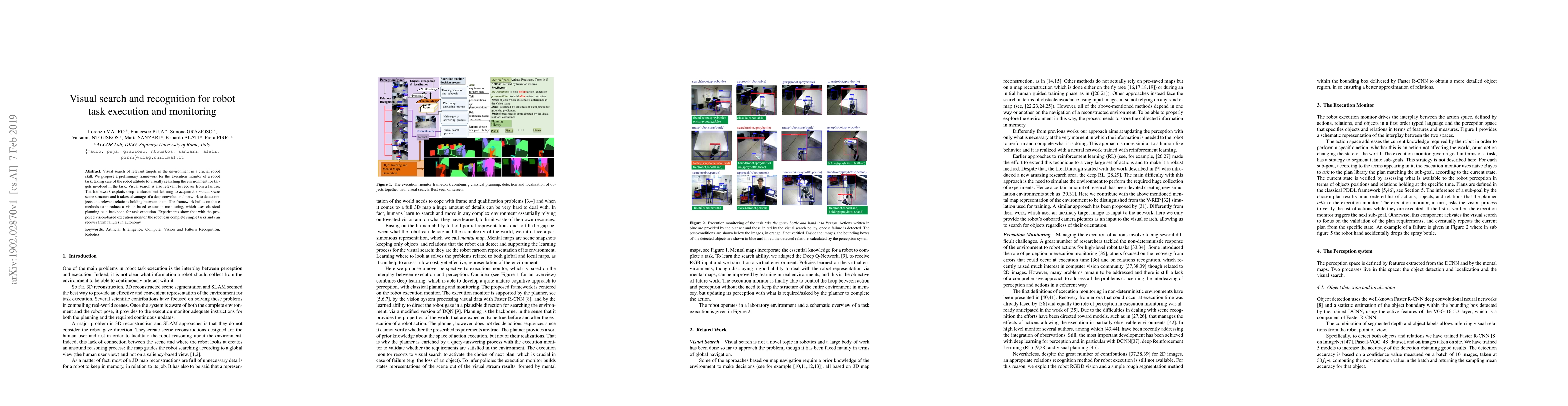 Visual search of relevant targets in the environment is a crucial robot skill. We propose a preliminary framework for the execution monitor of a robot task, taking care of the robot attitude to visually searching the environment for targets involved in the task. Visual search is also relevant to recover from a failure. The framework exploits deep reinforcement learning to acquire a "common sense" scene structure and it takes advantage of a deep convolutional network to detect objects and relevant relations holding between them. The framework builds on these methods to introduce a vision-based execution monitoring, which uses classical planning as a backbone for task execution. Experiments show that with the proposed vision-based execution monitor the robot can complete simple tasks and can recover from failures in autonomy.