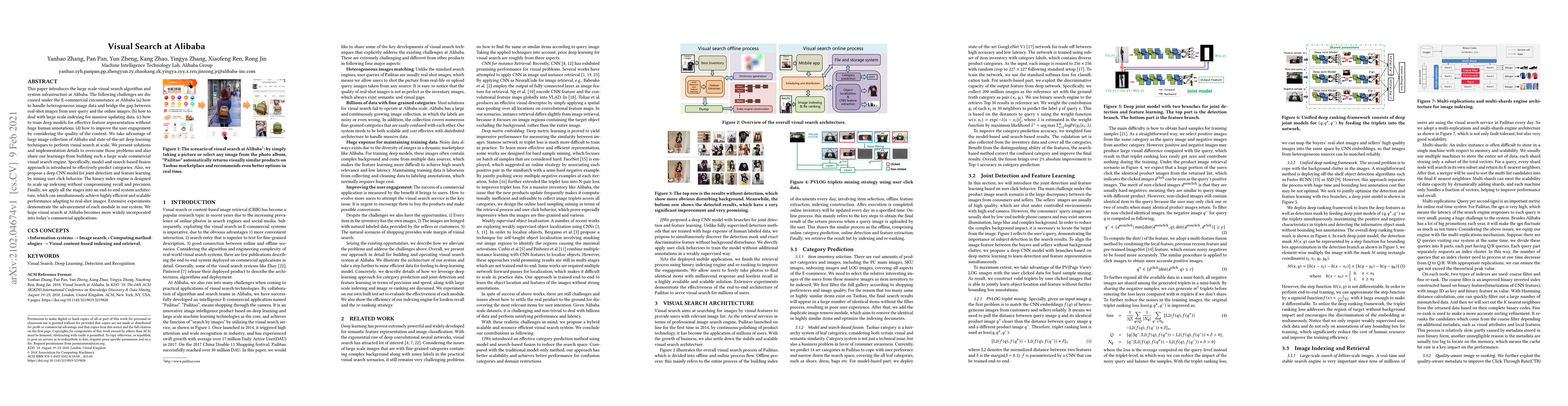 This paper details Alibaba's large-scale visual search system, addressing challenges in handling heterogeneous image data, large-scale indexing, deep model training, and user engagement. It introduces solutions like a model and search-based fusion approach, a deep CNN model for joint detection and feature learning, and a binary index engine for scalable indexing.