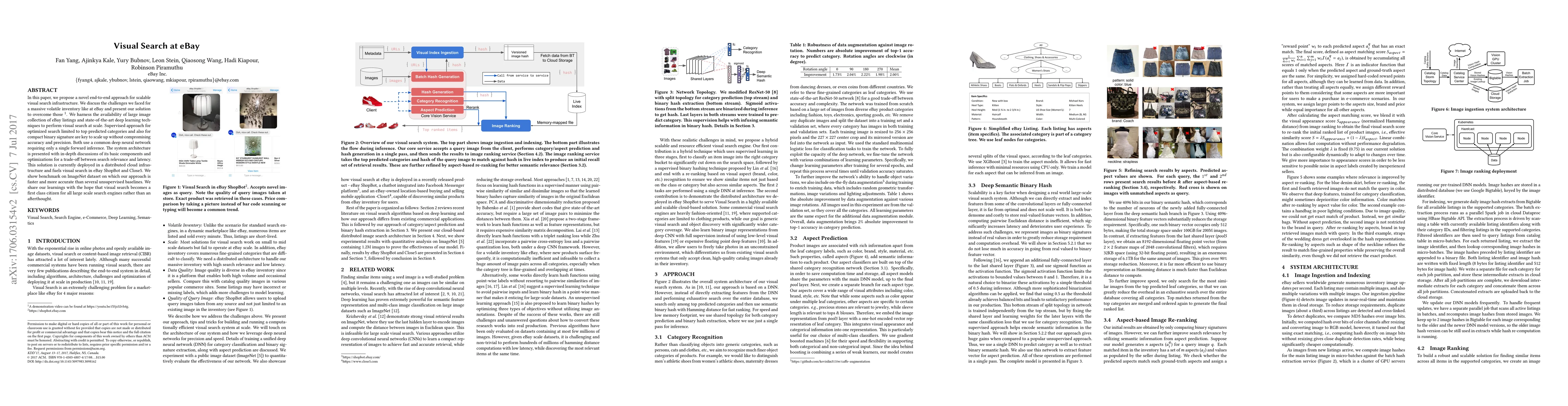 This paper introduces a scalable end-to-end visual search system for eBay, leveraging deep learning on large image collections and optimizing search through supervised techniques and compact binary signatures. The deployed solution balances search relevance and latency, outperforming unsupervised baselines on the ImageNet dataset.