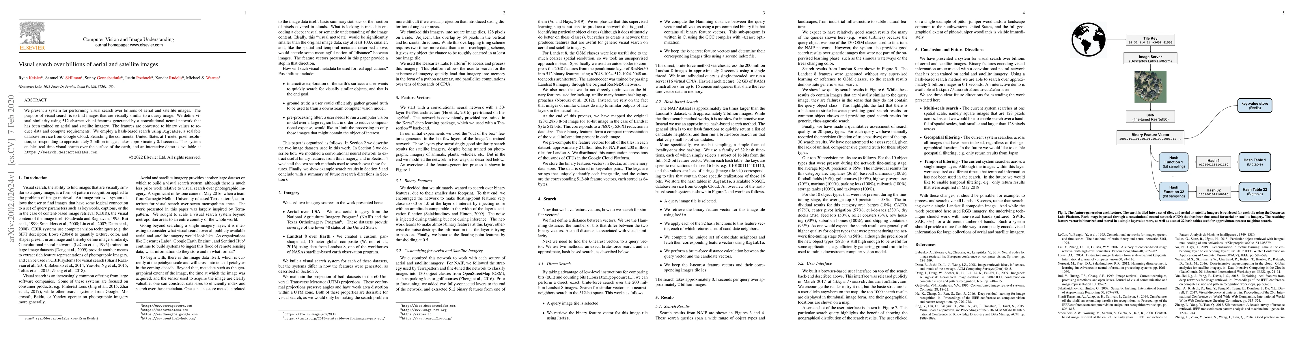 Researchers developed a system to search billions of aerial and satellite images using 512 abstract visual features, enabling real-time visual search over the surface of the earth in under 0.1 seconds.