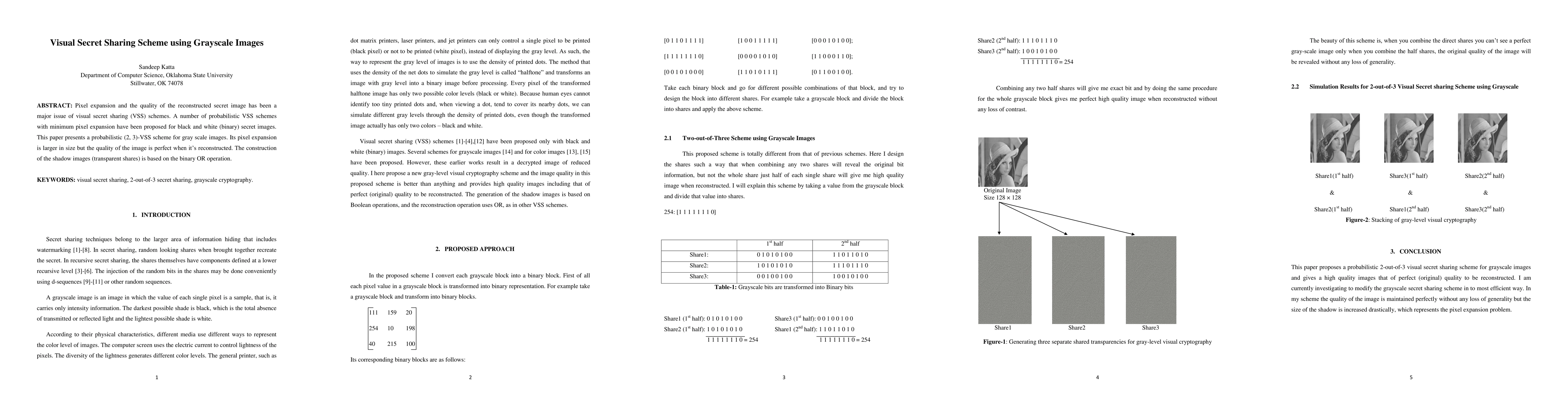This paper introduces a probabilistic (2, 3)-VSS scheme for grayscale images, addressing pixel expansion and image quality issues. While it has a larger pixel expansion compared to binary schemes, it ensures perfect reconstructed image quality through shadow images constructed via binary OR operations.