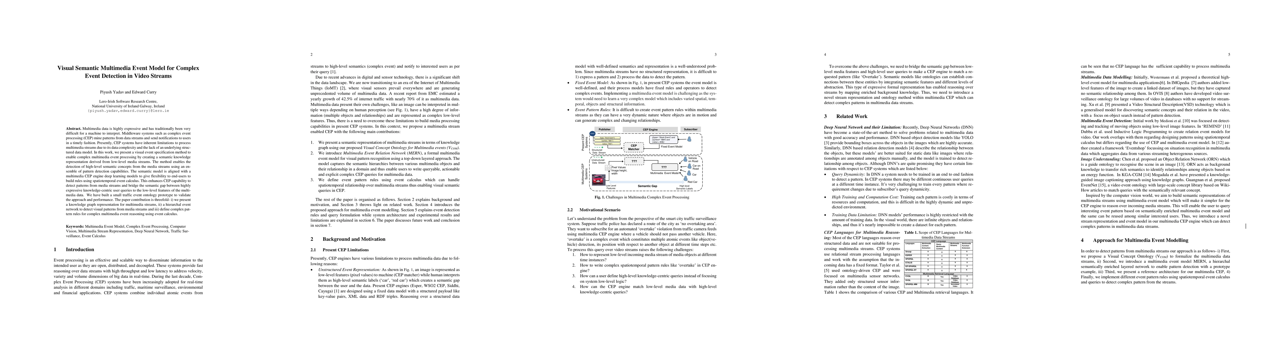This research introduces a visual semantic multimedia event model to enhance complex event detection in video streams. It presents a knowledge graph representation, a hierarchical event network for pattern detection, and complex pattern rules using spatiotemporal event calculus, validated through a traffic event ontology prototype.