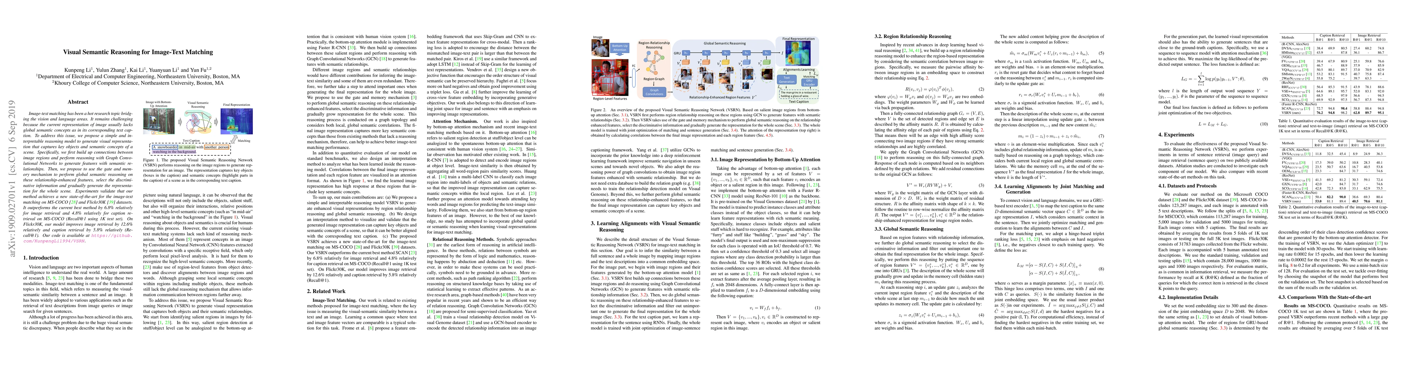 This paper proposes a visual semantic reasoning model to enhance image-text matching by generating visual representations that capture key objects and semantic concepts. The method uses Graph Convolutional Networks and a gate and memory mechanism for global semantic reasoning, achieving state-of-the-art results on MS-COCO and Flickr30K datasets.