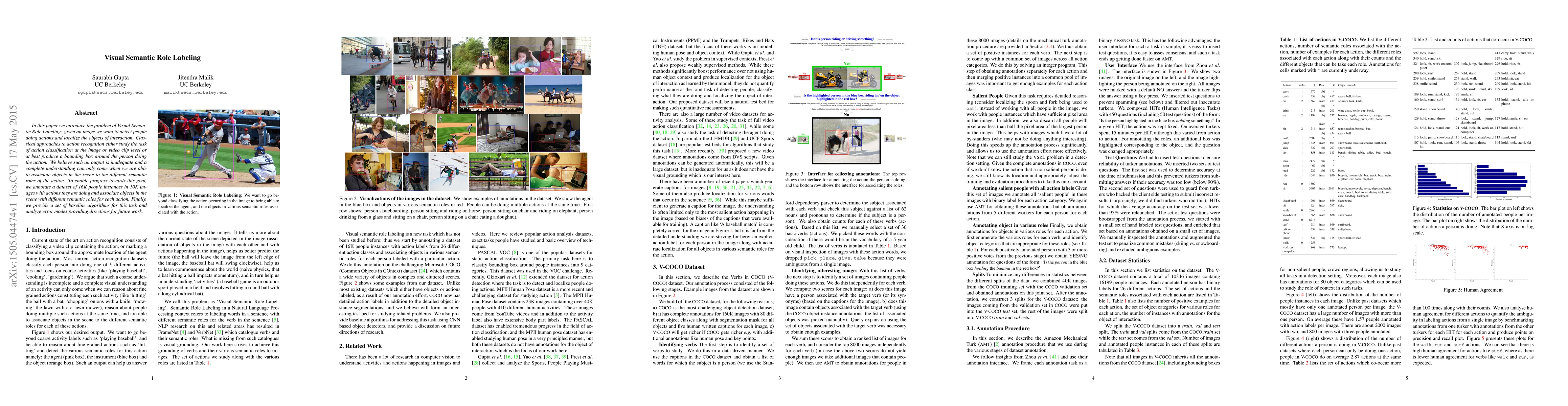 This paper introduces Visual Semantic Role Labeling, aiming to identify people performing actions in images and localize objects of interaction. It annotates a dataset with actions and associated objects, providing baseline algorithms and analyzing error modes to guide future research.