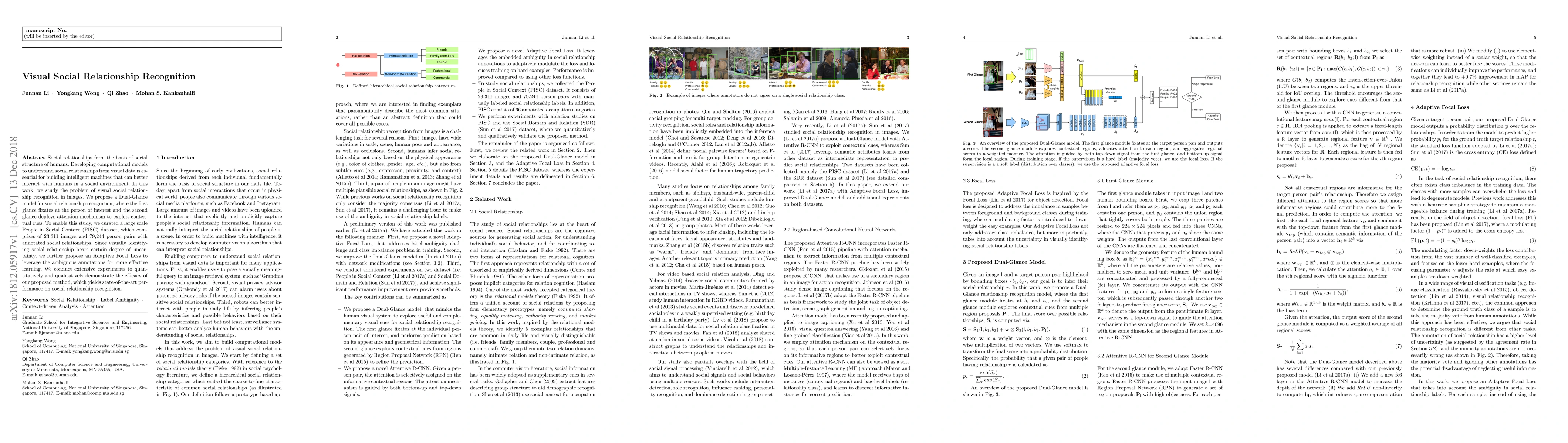 Social relationships form the basis of social structure of humans. Developing computational models to understand social relationships from visual data is essential for building intelligent machines that can better interact with humans in a social environment. In this work, we study the problem of visual social relationship recognition in images. We propose a Dual-Glance model for social relationship recognition, where the first glance fixates at the person of interest and the second glance deploys attention mechanism to exploit contextual cues. To enable this study, we curated a large scale People in Social Context (PISC) dataset, which comprises of 23,311 images and 79,244 person pairs with annotated social relationships. Since visually identifying social relationship bears certain degree of uncertainty, we further propose an Adaptive Focal Loss to leverage the ambiguous annotations for more effective learning. We conduct extensive experiments to quantitatively and qualitatively demonstrate the efficacy of our proposed method, which yields state-of-the-art performance on social relationship recognition.
