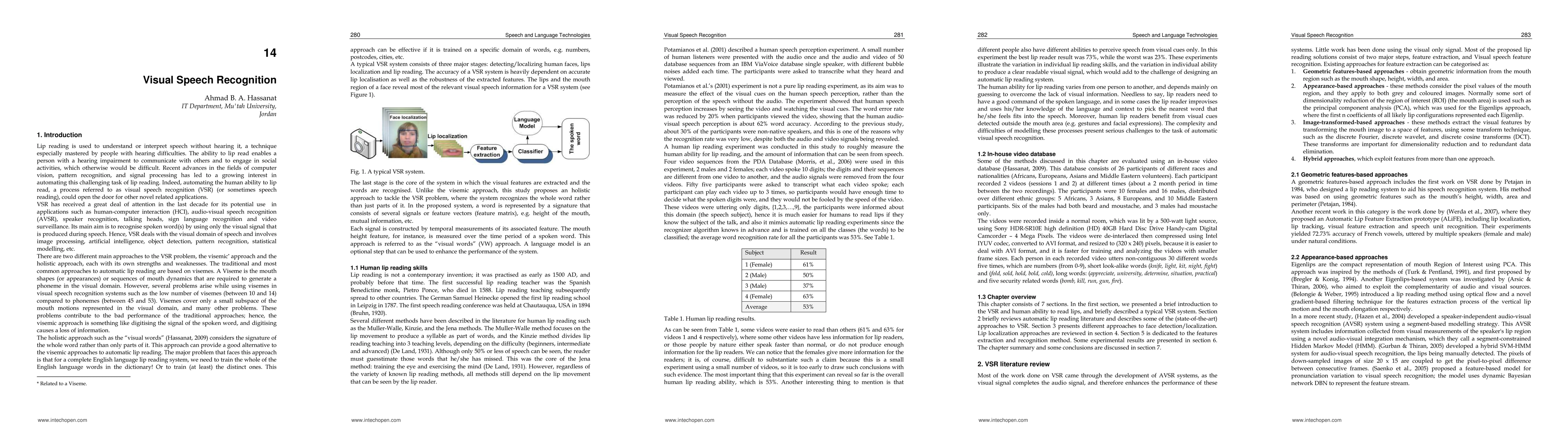 Lip reading is used to understand or interpret speech without hearing it, a technique especially mastered by people with hearing difficulties. The ability to lip read enables a person with a hearing impairment to communicate with others and to engage in social activities, which otherwise would be difficult. Recent advances in the fields of computer vision, pattern recognition, and signal processing has led to a growing interest in automating this challenging task of lip reading. Indeed, automating the human ability to lip read, a process referred to as visual speech recognition (VSR) (or sometimes speech reading), could open the door for other novel related applications. VSR has received a great deal of attention in the last decade for its potential use in applications such as human-computer interaction (HCI), audio-visual speech recognition (AVSR), speaker recognition, talking heads, sign language recognition and video surveillance. Its main aim is to recognise spoken word(s) by using only the visual signal that is produced during speech. Hence, VSR deals with the visual domain of speech and involves image processing, artificial intelligence, object detection, pattern recognition, statistical modelling, etc.