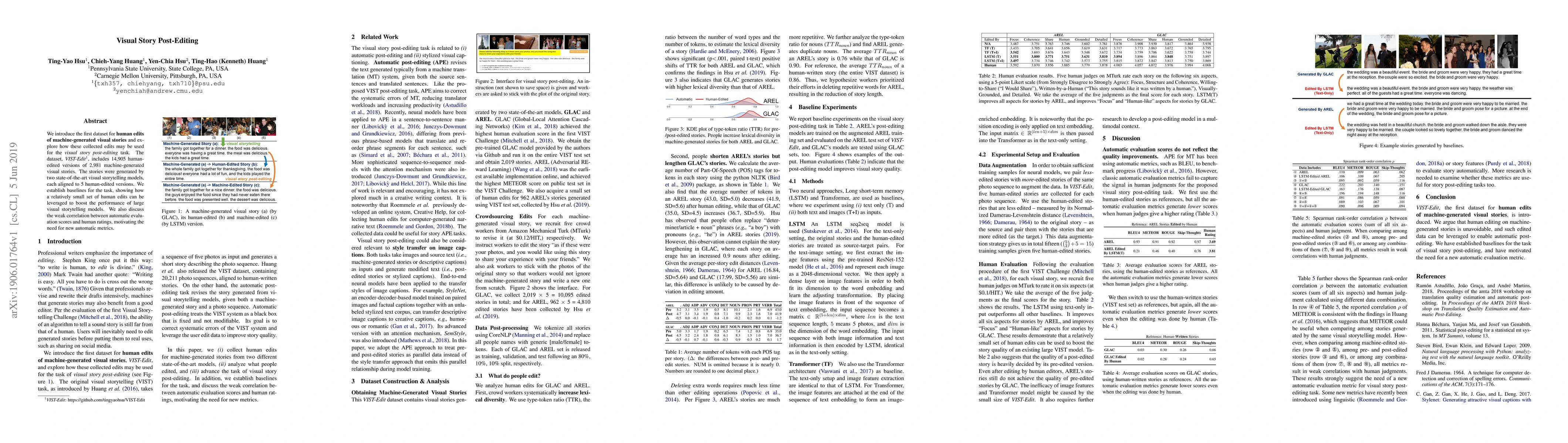 This paper introduces VIST-Edit, a dataset of human edits on machine-generated visual stories, and explores its use for improving visual story post-editing. The study establishes baselines demonstrating the potential of human edits to enhance large visual storytelling models, while highlighting the discrepancy between automatic evaluation metrics and human assessments.