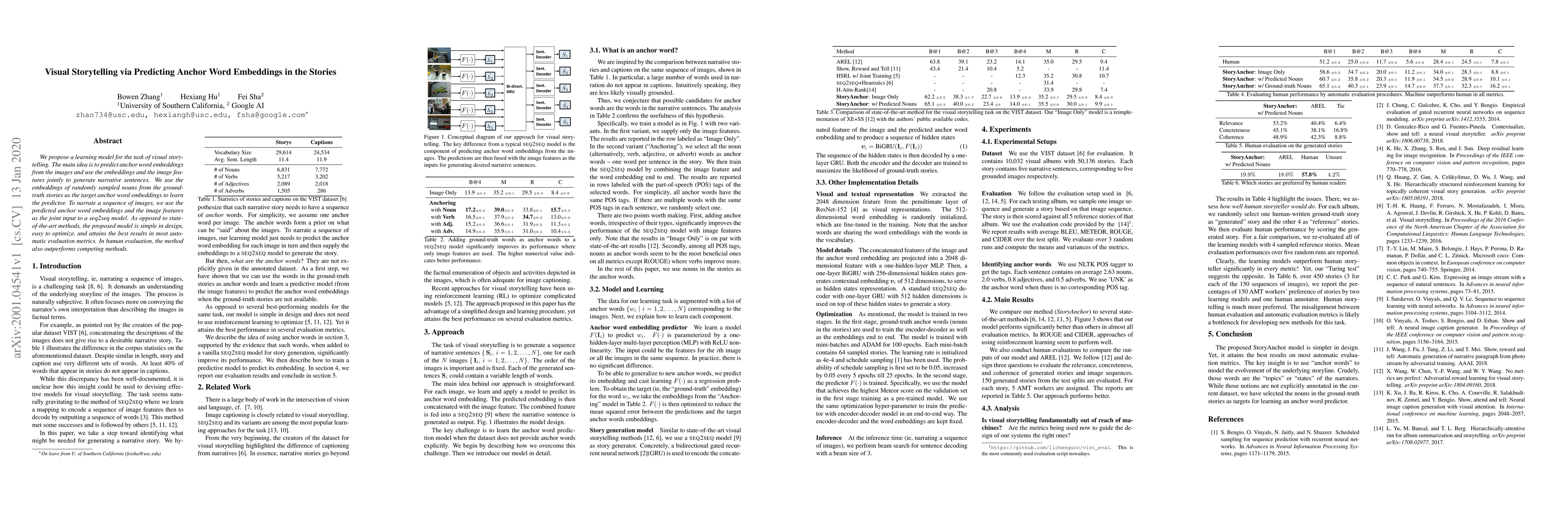 We propose a learning model for the task of visual storytelling. The main idea is to predict anchor word embeddings from the images and use the embeddings and the image features jointly to generate narrative sentences. We use the embeddings of randomly sampled nouns from the groundtruth stories as the target anchor word embeddings to learn the predictor. To narrate a sequence of images, we use the predicted anchor word embeddings and the image features as the joint input to a seq2seq model. As opposed to state-of-the-art methods, the proposed model is simple in design, easy to optimize, and attains the best results in most automatic evaluation metrics. In human evaluation, the method also outperforms competing methods.