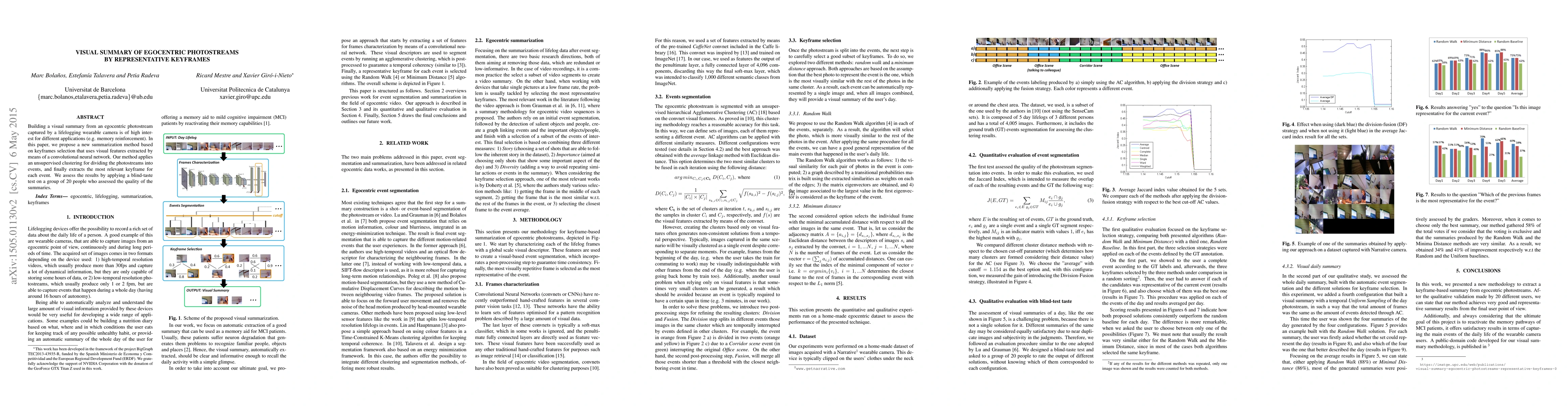 Building a visual summary from an egocentric photostream captured by a lifelogging wearable camera is of high interest for different applications (e.g. memory reinforcement). In this paper, we propose a new summarization method based on keyframes selection that uses visual features extracted by means of a convolutional neural network. Our method applies an unsupervised clustering for dividing the photostreams into events, and finally extracts the most relevant keyframe for each event. We assess the results by applying a blind-taste test on a group of 20 people who assessed the quality of the summaries.