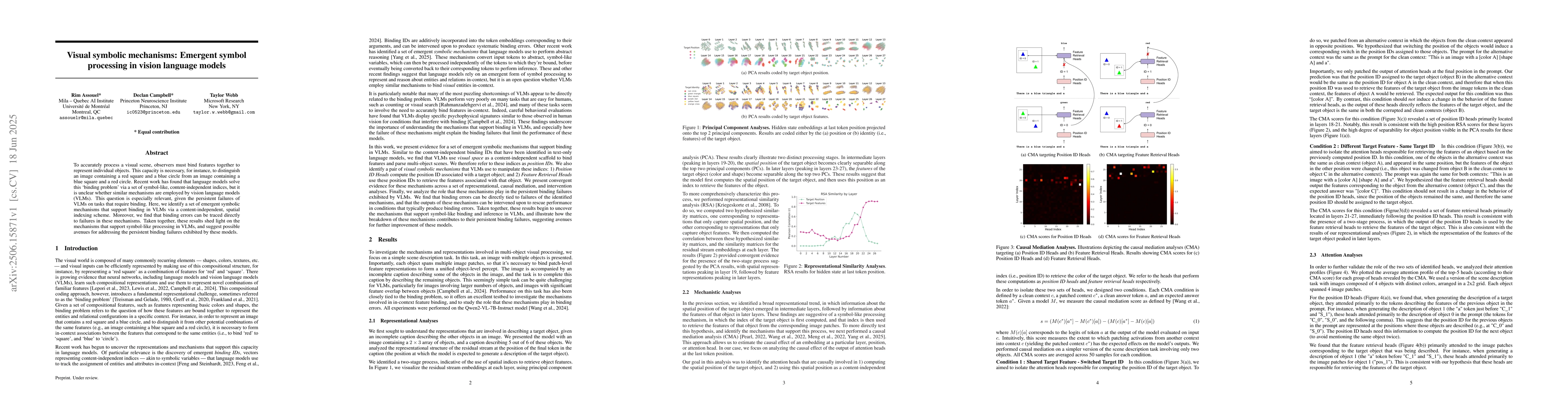 To accurately process a visual scene, observers must bind features together to represent individual objects. This capacity is necessary, for instance, to distinguish an image containing a red square and a blue circle from an image containing a blue square and a red circle. Recent work has found that language models solve this 'binding problem' via a set of symbol-like, content-independent indices, but it is unclear whether similar mechanisms are employed by vision language models (VLMs). This question is especially relevant, given the persistent failures of VLMs on tasks that require binding. Here, we identify a set of emergent symbolic mechanisms that support binding in VLMs via a content-independent, spatial indexing scheme. Moreover, we find that binding errors can be traced directly to failures in these mechanisms. Taken together, these results shed light on the mechanisms that support symbol-like processing in VLMs, and suggest possible avenues for addressing the persistent binding failures exhibited by these models.