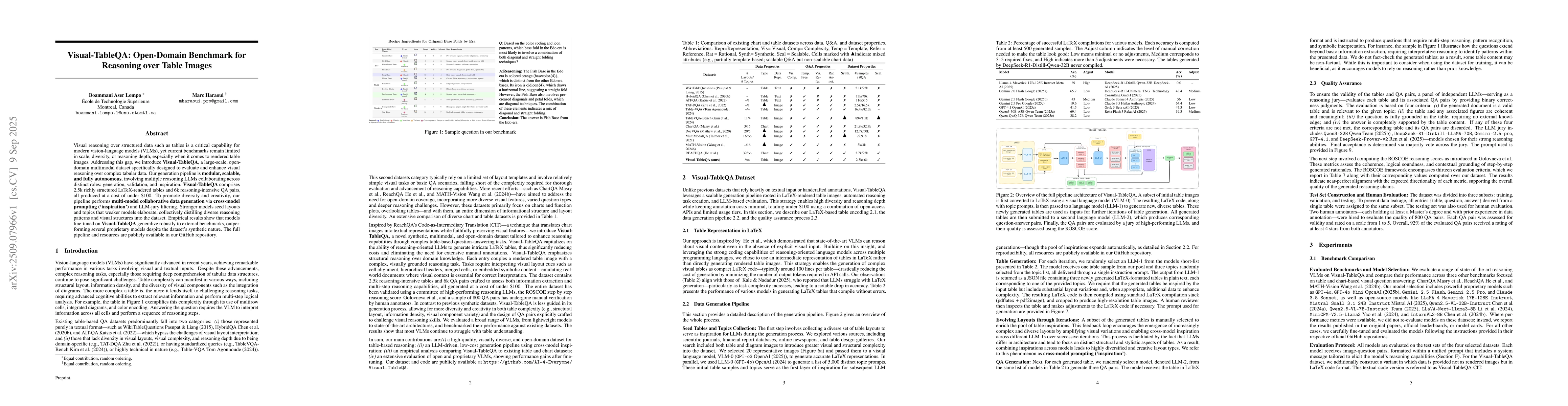 Visual reasoning over structured data such as tables is a critical capability for modern vision-language models (VLMs), yet current benchmarks remain limited in scale, diversity, or reasoning depth, especially when it comes to rendered table images. Addressing this gap, we introduce Visual-TableQA, a large-scale, open-domain multimodal dataset specifically designed to evaluate and enhance visual reasoning over complex tabular data. Our generation pipeline is modular, scalable, and fully autonomous, involving multiple reasoning LLMs collaborating across distinct roles: generation, validation, and inspiration. Visual-TableQA comprises 2.5k richly structured LaTeX-rendered tables and 6k reasoning-intensive QA pairs, all produced at a cost of under USD 100. To promote diversity and creativity, our pipeline performs multi-model collaborative data generation via cross-model prompting ('inspiration') and LLM-jury filtering. Stronger models seed layouts and topics that weaker models elaborate, collectively distilling diverse reasoning patterns and visual structures into the dataset. Empirical results show that models fine-tuned on Visual-TableQA generalize robustly to external benchmarks, outperforming several proprietary models despite the dataset's synthetic nature. The full pipeline and resources are publicly available at https://github.com/AI-4-Everyone/Visual-TableQA.