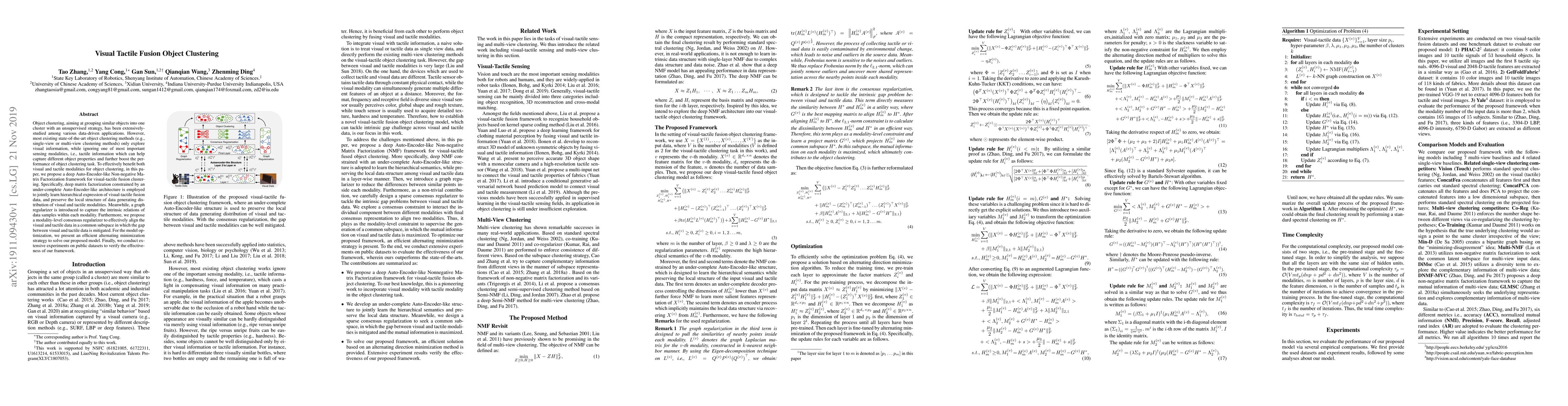 This paper proposes a deep Auto-Encoder-like Non-negative Matrix Factorization framework for clustering objects using both visual and tactile information. The method aims to leverage the complementary properties of visual and tactile data to improve clustering performance, employing a consensus regularizer to align the two modalities in a common subspace.