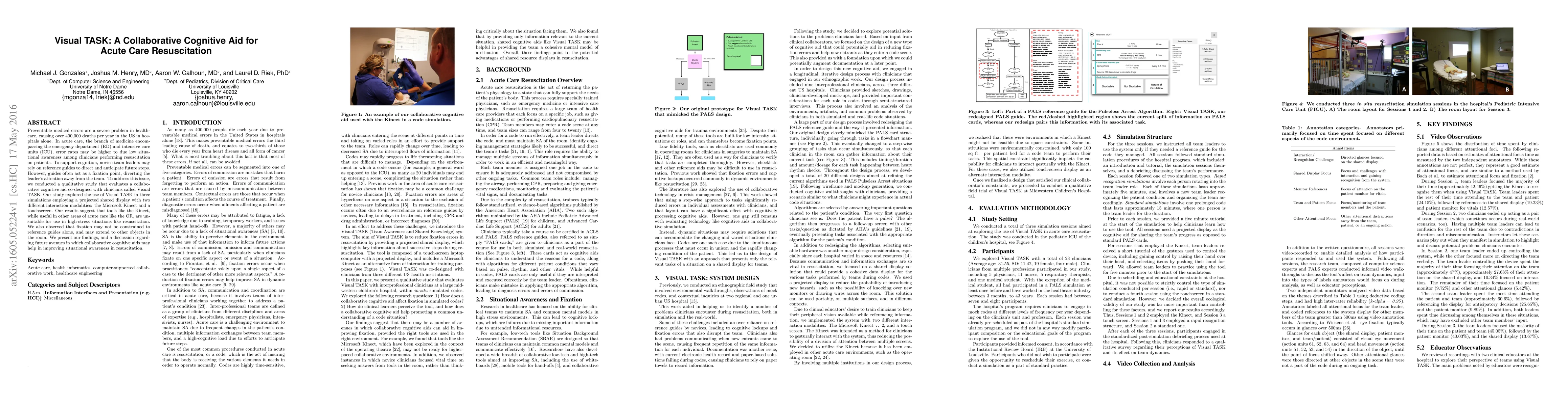 Preventable medical errors are a severe problem in healthcare, causing over 400,000 deaths per year in the US in hospitals alone. In acute care, the branch of medicine encompassing the emergency department (ED) and intensive care units (ICU), error rates may be higher to due low situational awareness among clinicians performing resuscitation on patients. To support cognition, novice team leaders may rely on reference guides to direct and anticipate future steps. However, guides often act as a fixation point, diverting the leader's attention away from the team. To address this issue, we conducted a qualitative study that evaluates a collaborative cognitive aid co-designed with clinicians called Visual TASK. Our study explored the use of Visual TASK in three simulations employing a projected shared display with two different interaction modalities: the Microsoft Kinect and a touchscreen. Our results suggest that tools like the Kinect, while useful in other areas of acute care like the OR, are unsuitable for use in high-stress situations like resuscitation. We also observed that fixation may not be constrained to reference guides alone, and may extend to other objects in the room. We present our findings, and a discussion regarding future avenues in which collaborative cognitive aids may help in improving situational awareness in resuscitation.