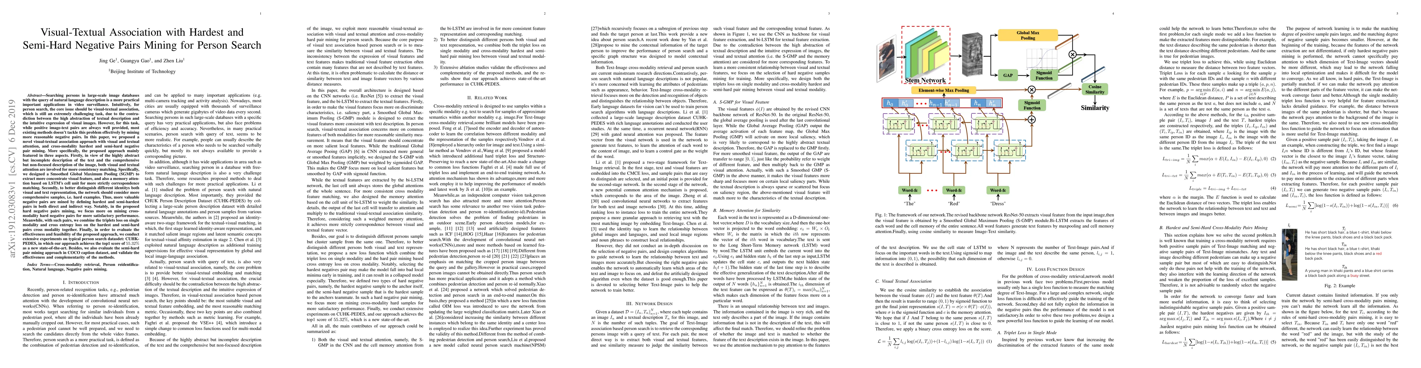 This paper proposes a novel visual-textual association method incorporating visual and textual attention, along with mining hardest and semi-hard negative pairs to improve person search in large-scale image databases. The approach achieves a state-of-the-art top1 score of 55.32% on the CUHK-PEDES dataset.