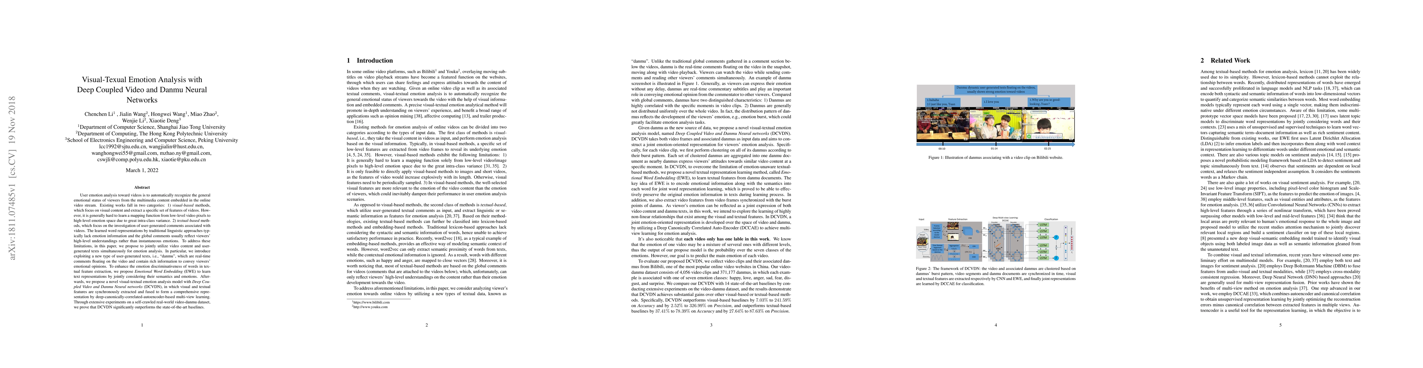 This paper proposes a novel visual-textual emotion analysis model using Deep Coupled Video and Danmu Neural Networks (DCVDN) to jointly analyze video content and real-time comments ("danmu") for better emotion recognition. It introduces an Emotional Word Embedding (EWE) to enhance emotion discriminativeness in text representation, achieving superior performance over state-of-the-art baselines.