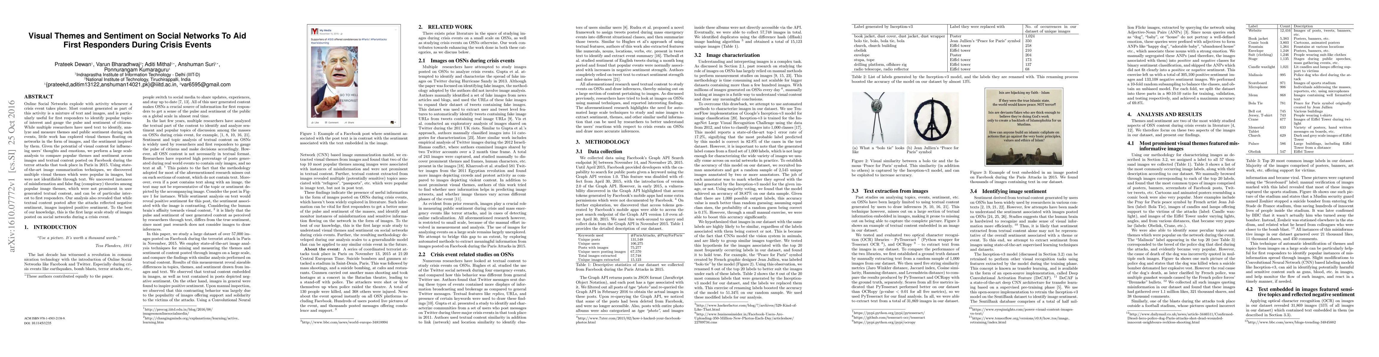 Researchers analyzed social media images from the 2015 Paris attacks to identify visual themes and sentiment, finding that images inspired positive emotions while textual content showed negative sentiment, and uncovered instances of misinformation.
